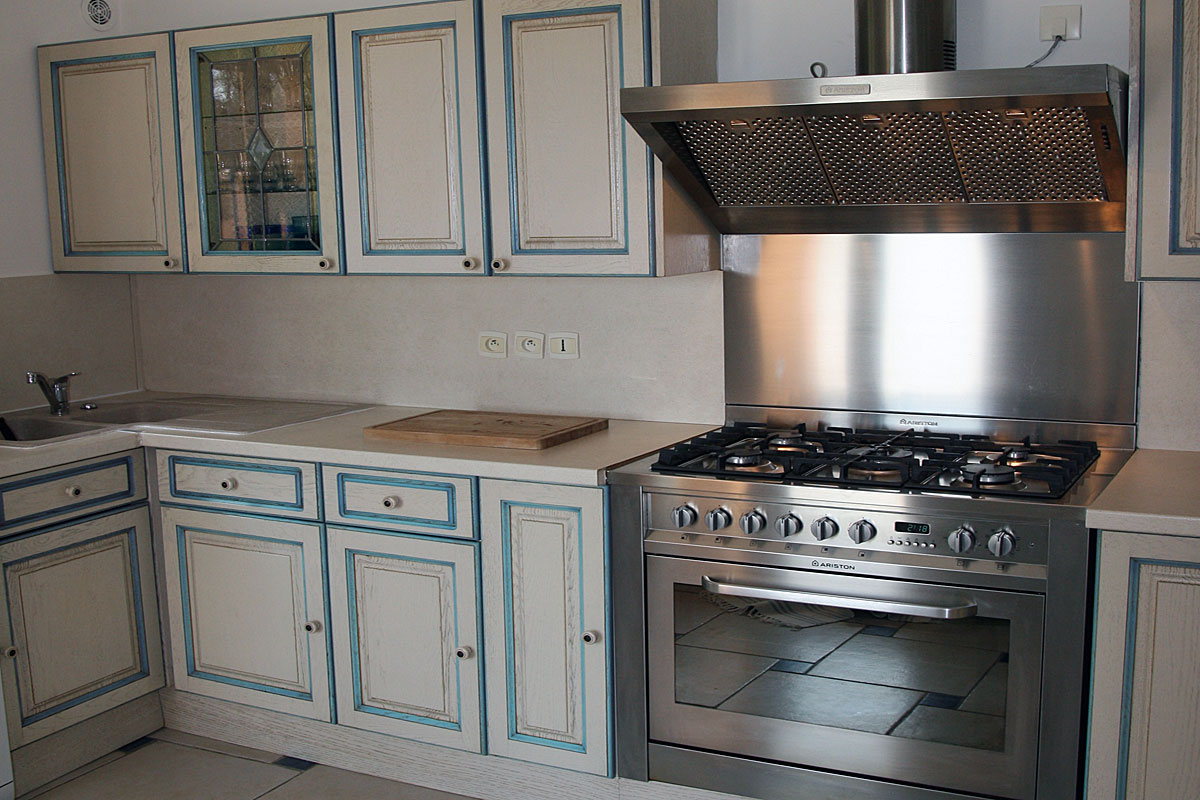 A traditional kitchen, which is well equipped including a Nespresso coffee machine. This opens onto the West terrace which has a dining table and an electric BBQ.