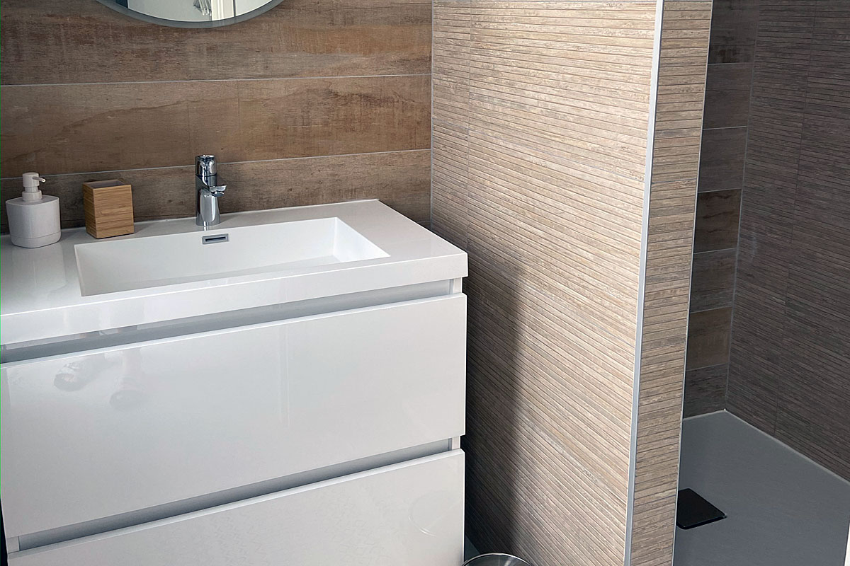 Bedroom 2 - 160cm bed, door with electric shutters out to the pool. The ensuite shower room, is a Jack and Jill style with bedroom 3. On entering from either side, each room has its own wash basin and the shower is in the middle.