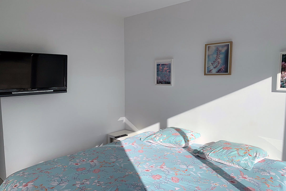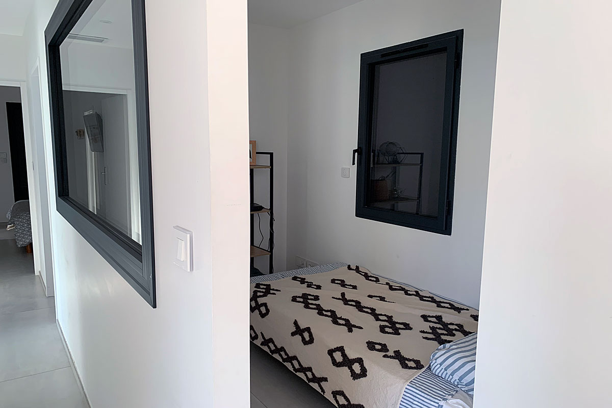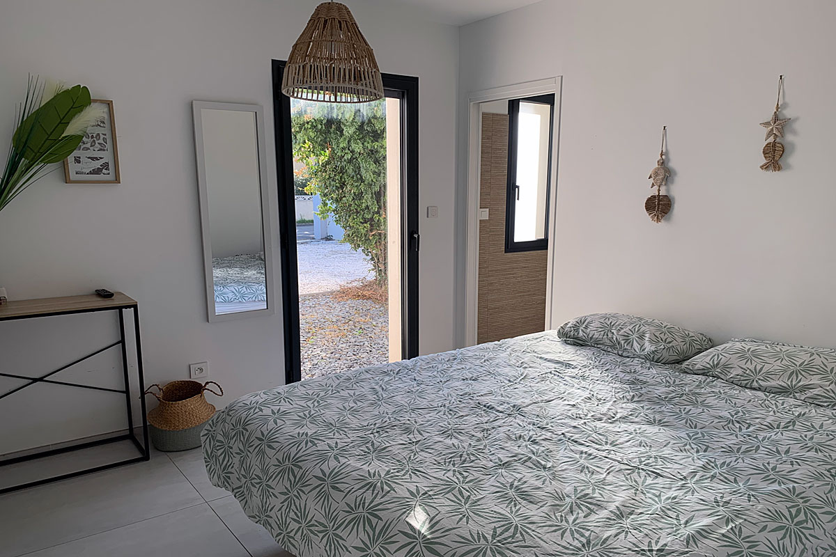 Bedroom 3 - 140cm bed, door with electric shutters to the side terrace and petanque area. Ensuite Jack and Jill style shower room shared with bedroom 2.