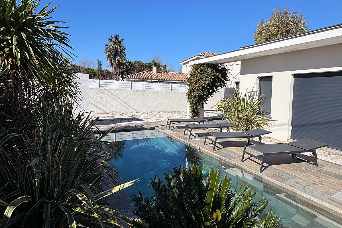 South of France modern holiday villa, just a 5 minute walk from Rochelongue beach, Agde in the South of France. Air-conditioned, private pool, walking distance to restaurants, 15 Minute drive from Beziers airport. Flexible arrival may be possible.