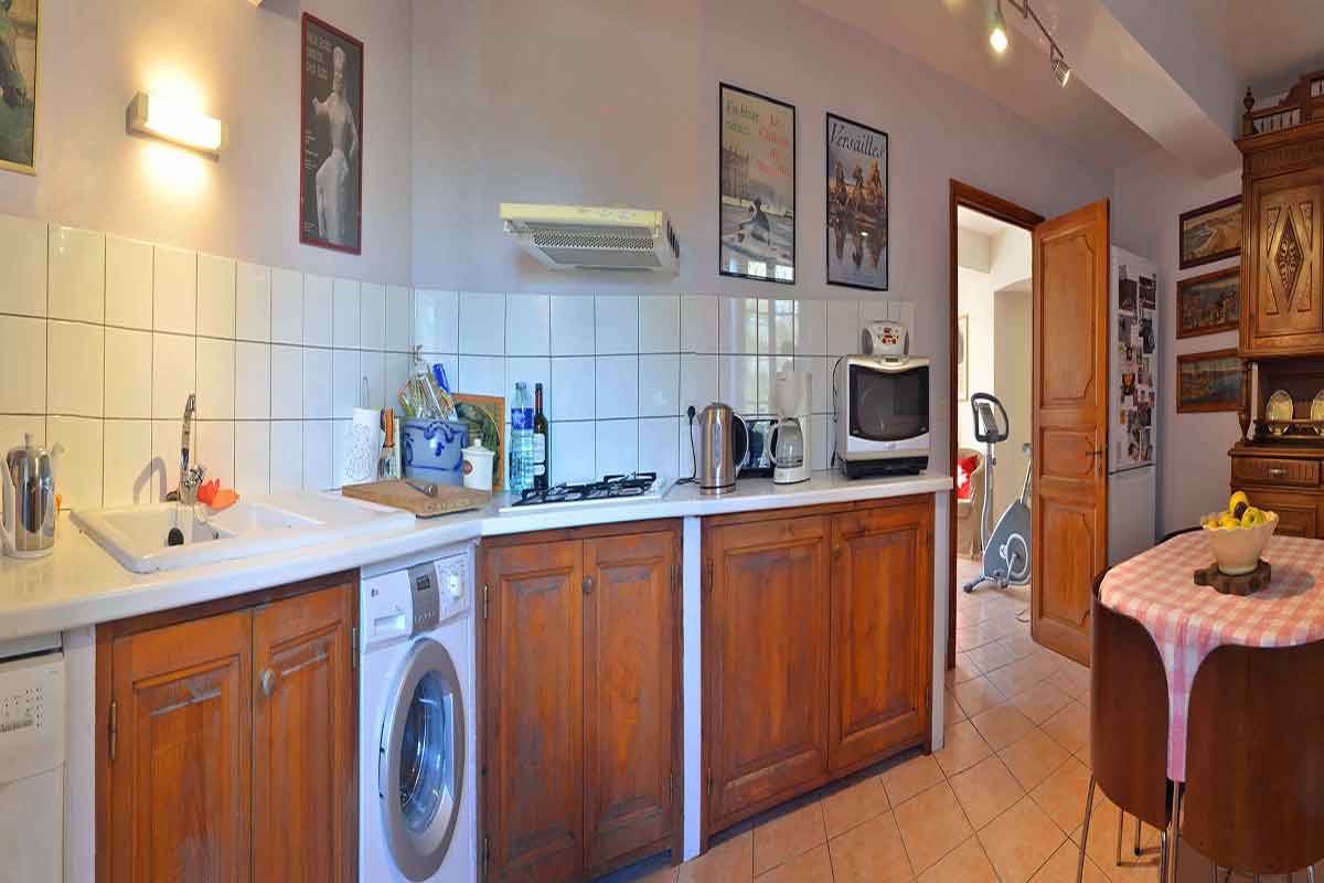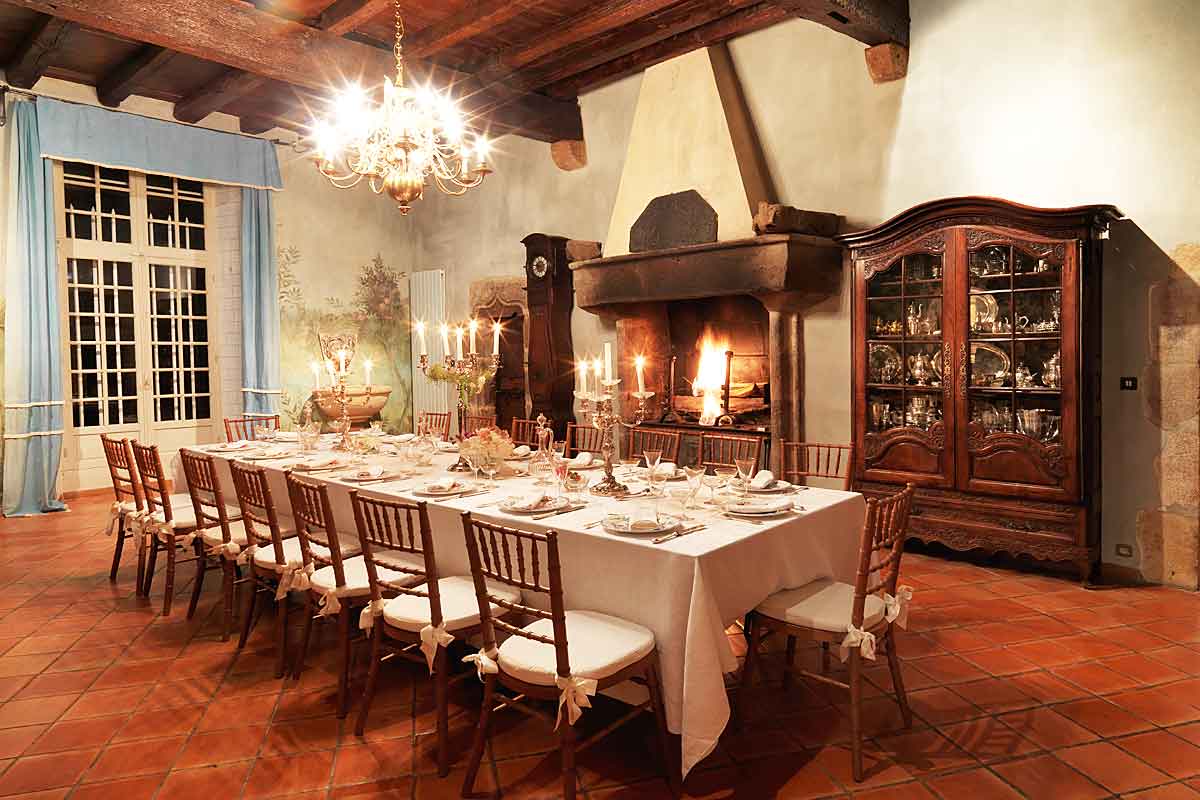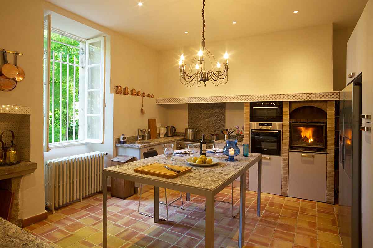 The Woad Dining room, 44m2, is adorned with murals and tapestries with a table to sit 20 people. It has a working fireplace. A door takes you into the kitchen, with a working fireplace and very well equipped with 2 ovens and 2 dishwashers. From the kitchen there are stairs leading to the garden.