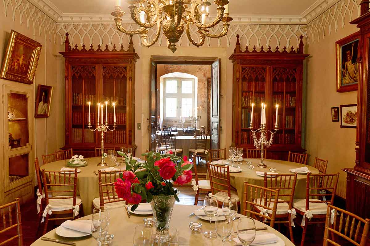 The Knights' Hall - an 86m2 with a dominating floor to ceiling 16th century fire place and bookcases all around. This magnificent hall can seat up to 130 people (not available for use outside weddings/events).