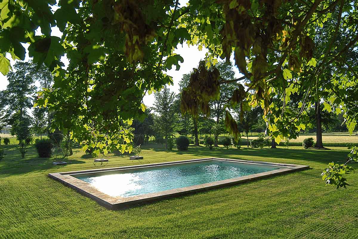 To the side of the Chateau, the swimming pool, 10m x 6m and 1.6m deep, sits on the manicured lawns which spill over into the fields beyond. There is a little stream that runs through the grounds.