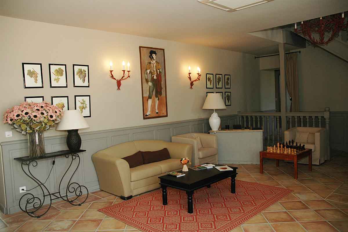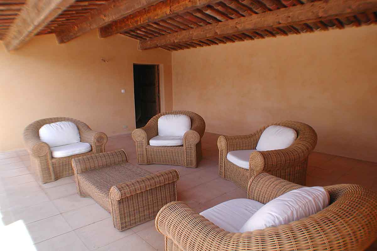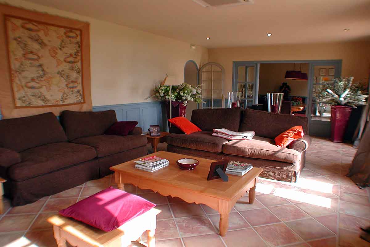 Spacious 60m2 entry hall, furnished with sofa and 2 armchairs, which leads through to the large and airy sitting room which has two very large sofas. French windows lead out to the terrace.