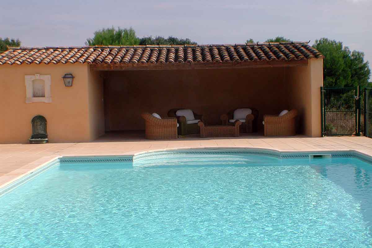 The 12m x 6m x 1.2-2m swimming pool (partly walled, partly fenced) has an enormous sunny terrace with plenty of loungers and a covered terrace with very comfortable wicker furniture and a pool house.
