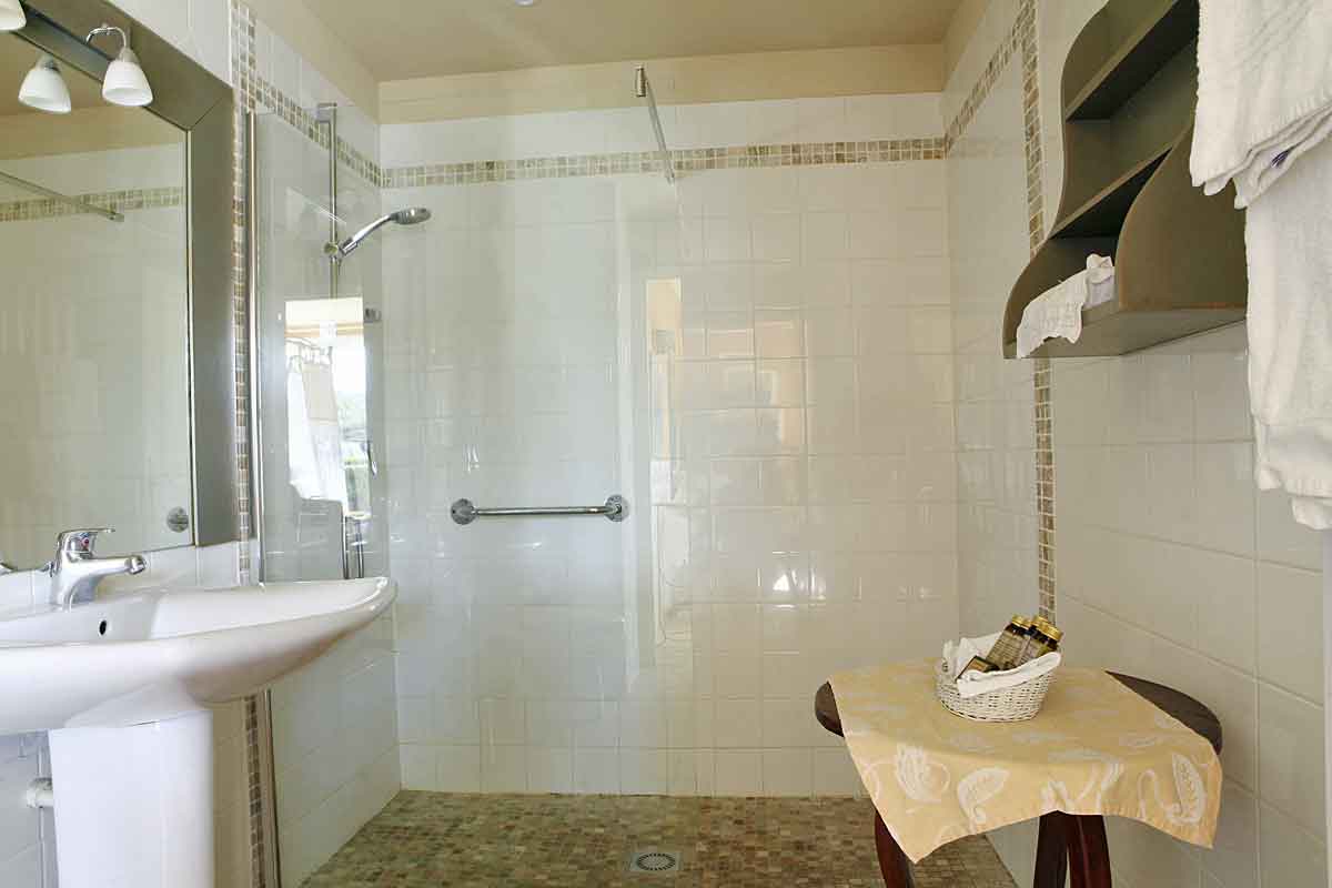 Bedroom 1 - 22 m2 , ground floor, north facing, with terrace, king size bed, Italian shower, mini bar, safe, large flat screen TV, air-con.