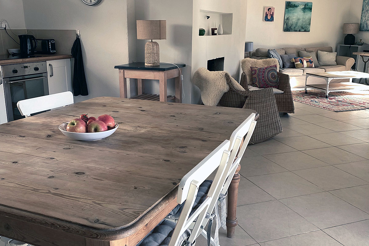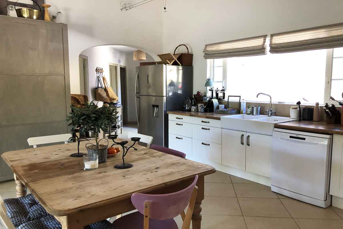 The main entrance opens into the large and airy kitchen with white fitted units and is very well equipped with everything needed for a comfortable family holiday.  A Belfast double sink, dishwasher, full oven with four ring hob, extractor fan, microwave and an American fridge/freezer. A large table has seating for six. Wonderful sliding doors open onto the covered dining terrace, bringing the lovely views onto the pool area and gardens inside!