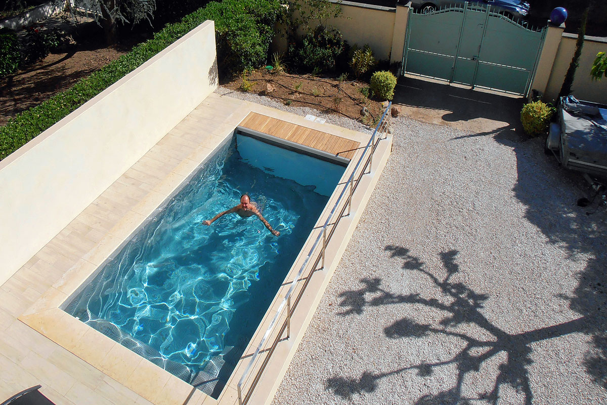 It measures 5m x 3m x 1.40m deep, as you access the pool from the corner steps there is a seating area with a bubble facility, one hesitates to say Jacuzzi or Spa however still a nice feature. The pool has an electric cover, which is great for keeping the heat in overnight.
