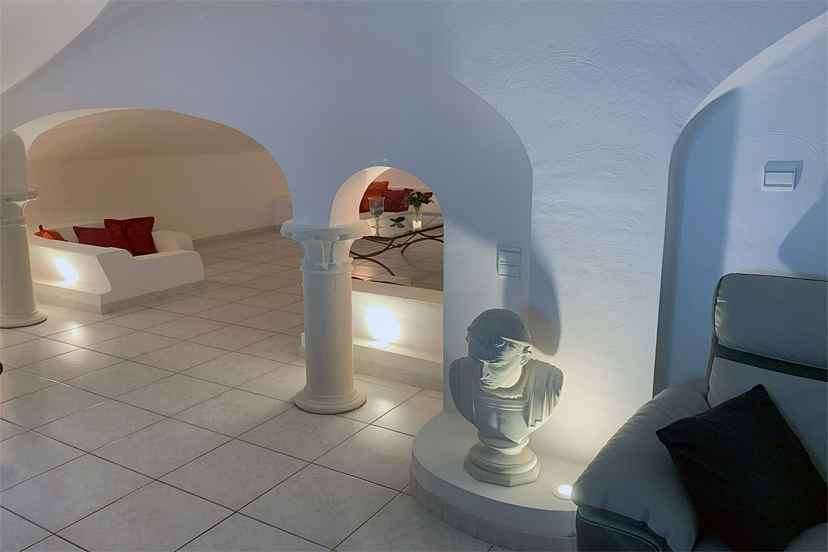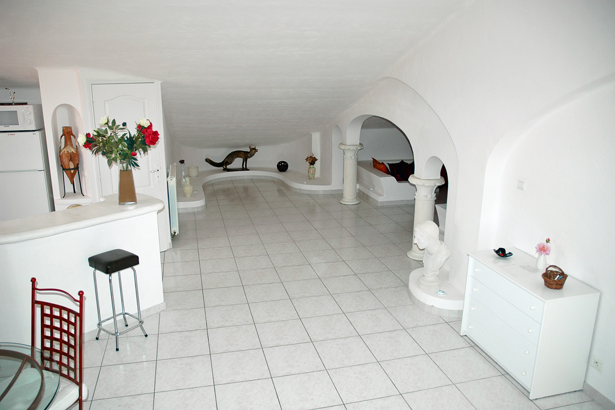 The spacious dining area and kitchen adjoin a most unusual sitting area, which could be described as a 'neo-classical salon'. It has a low sloping ceiling, in-built seating and a three-foot Bernini statue (not an original we hasten to add!). Comfortable sofa too.