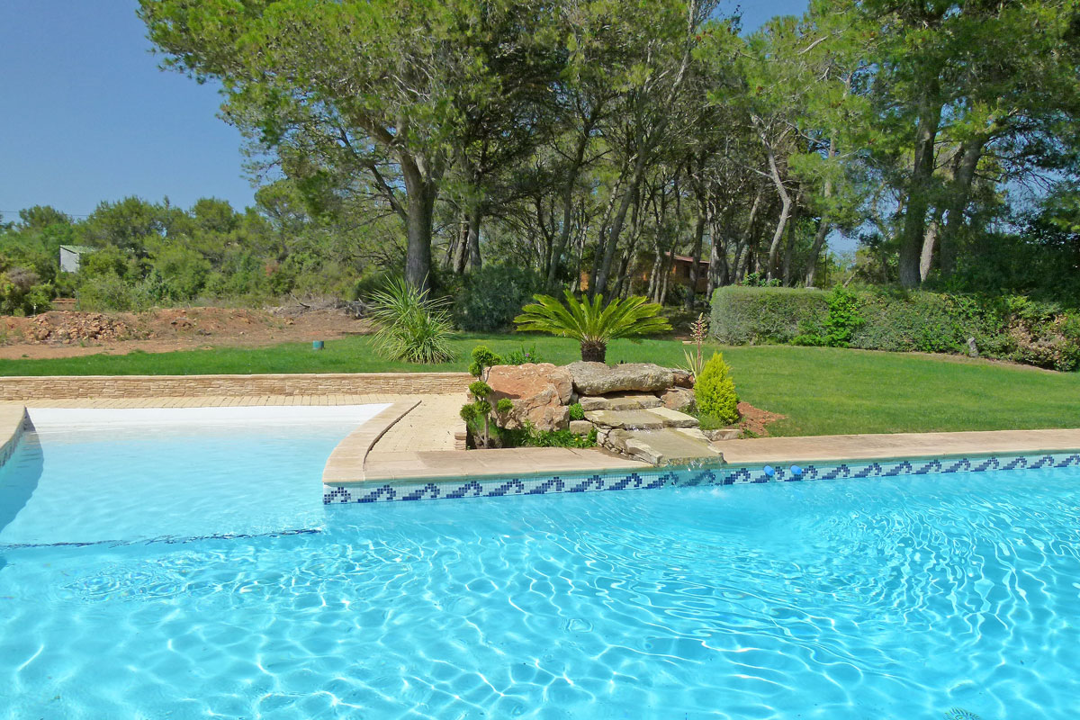 The large garden and luxurious swimming pool are a delight. A stand of mature pine trees leads to the well-kept lawn, interspersed with palms and flower beds.