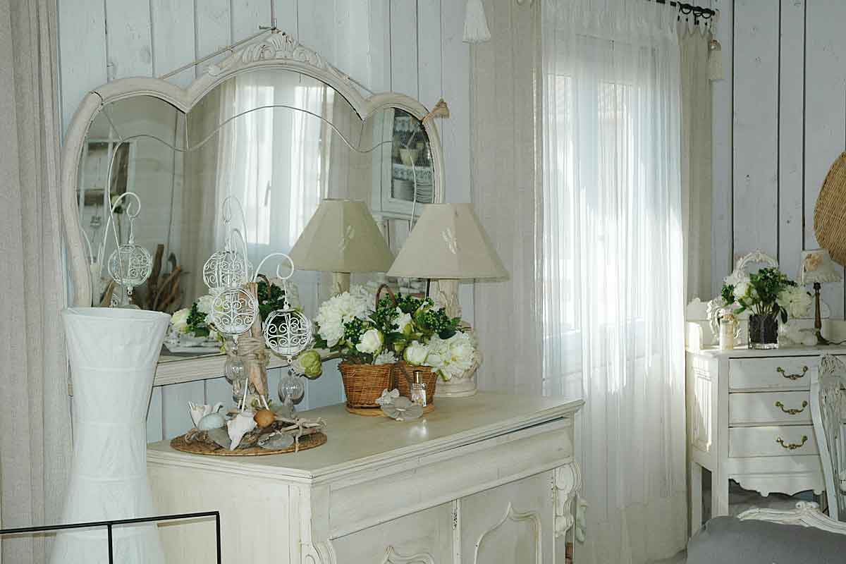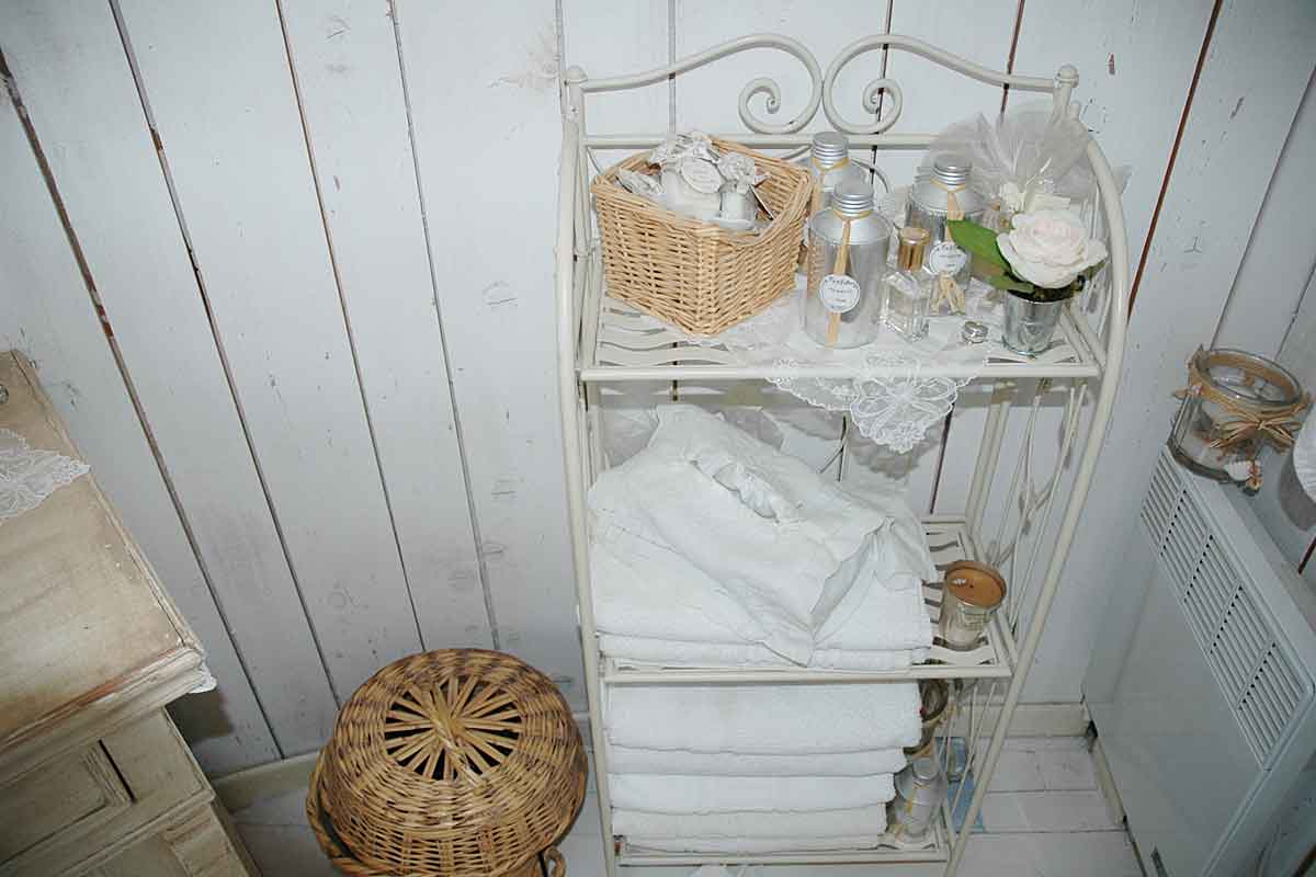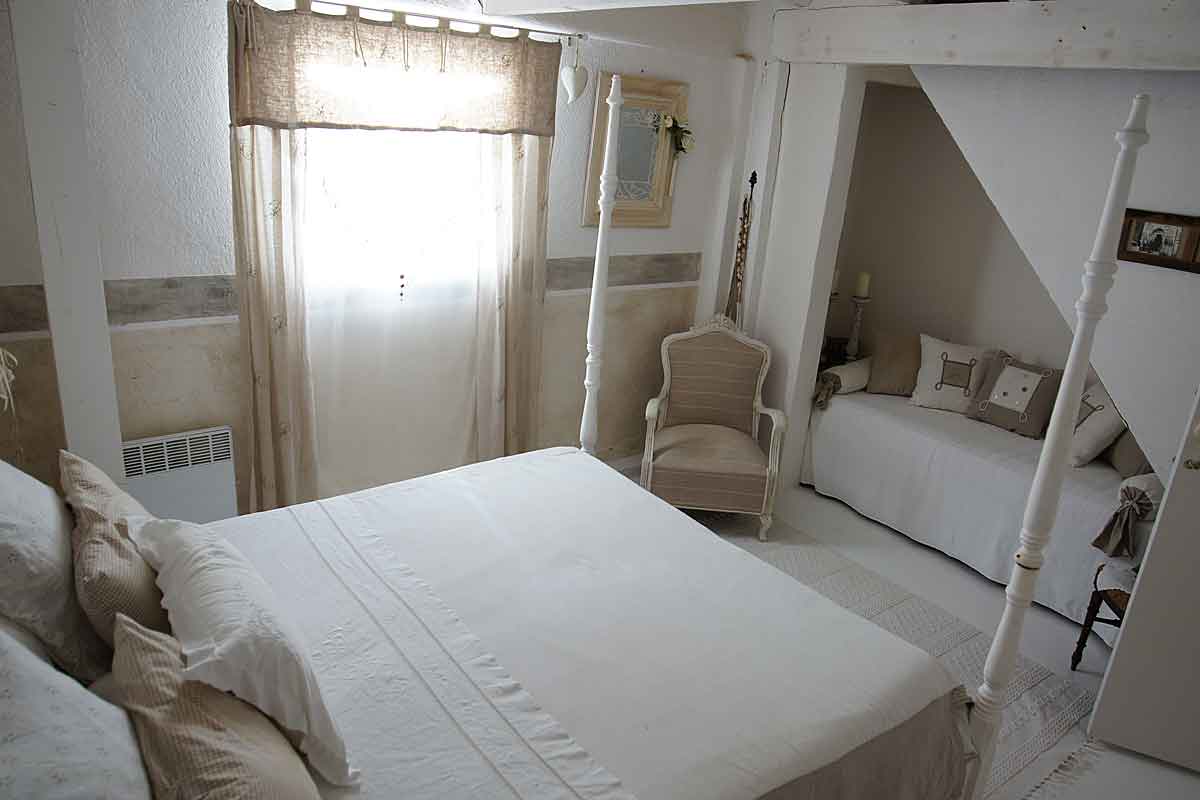 On this level there is an air-conditioned open plan living area beautifully decorated, with a high ceiling and all the wooden slatted interior is painted white featuring scalloped coving detail. The furniture is in the "distressed style" a painted sideboard and side tables, matching mirrors, dining table for 6, plus a sofa, two arm chairs and many treasured "objets". There is of course a TV offering French satellite channels, but the view is a better picture!