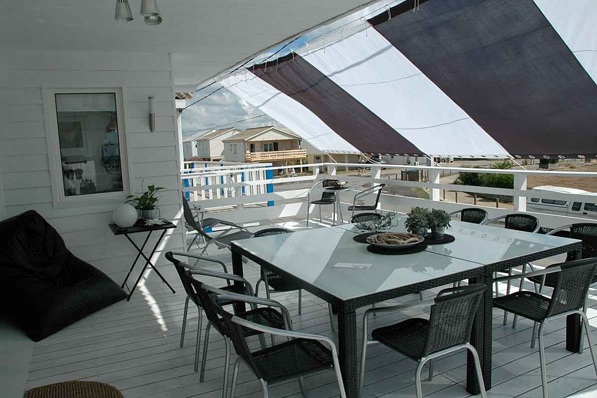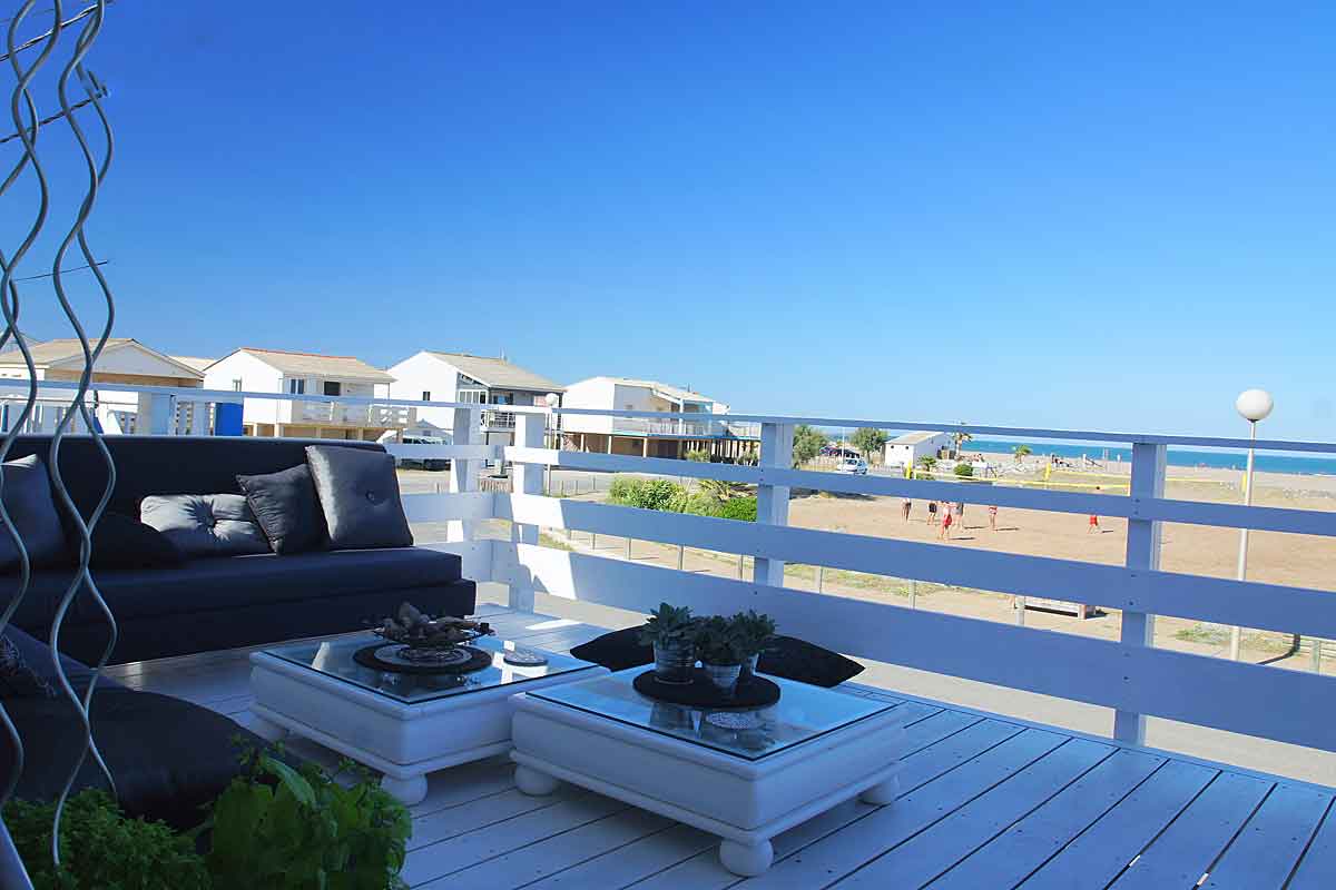 Holiday villa on the beach, this beachfront chalet situated on Gruissan plage near Narbonne, South of France has 3 bedrooms, beautifully decorated, an amazing air-conditioned living area and large terrace overlooking the Mediterranean sea and beach. Flexible arrival/departure days in Low Season .
