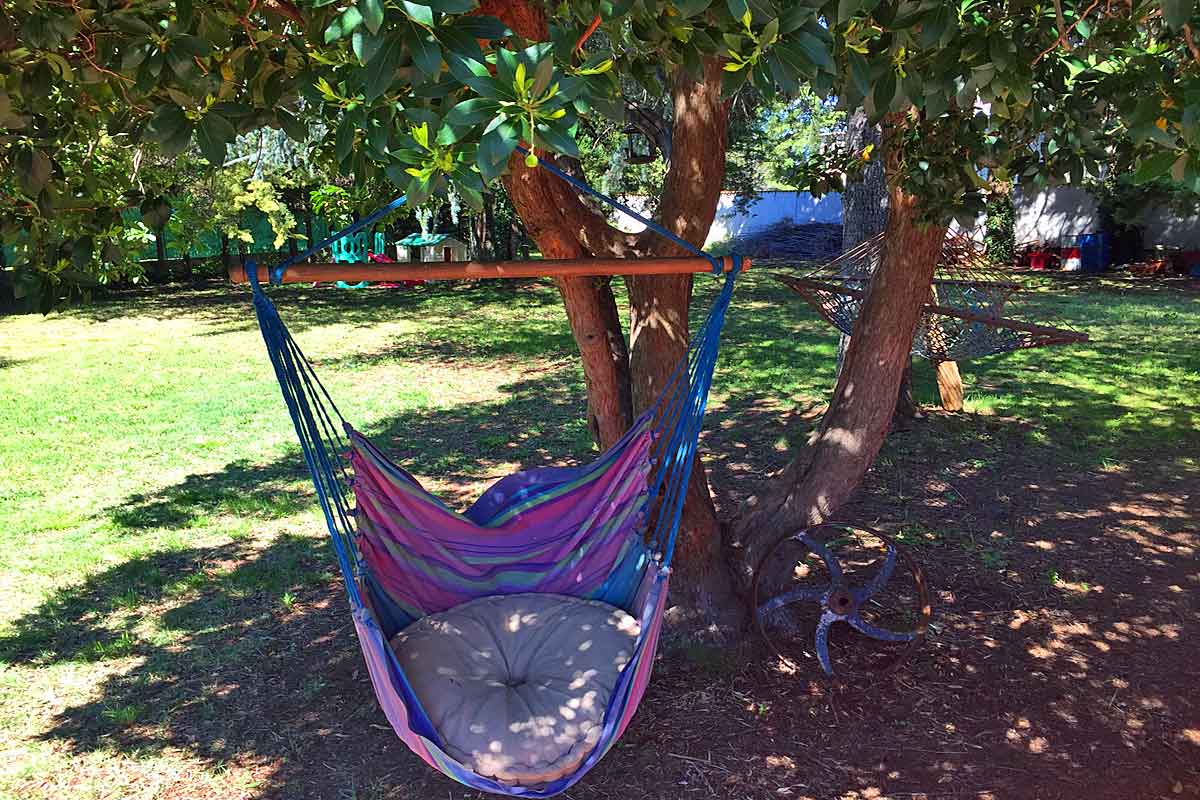 In the front garden there is a large grassy area with pine and palm trees, and plenty of space to kick a football around and there is a small trampoline. The garden is completely enclosed by a thick hedge.