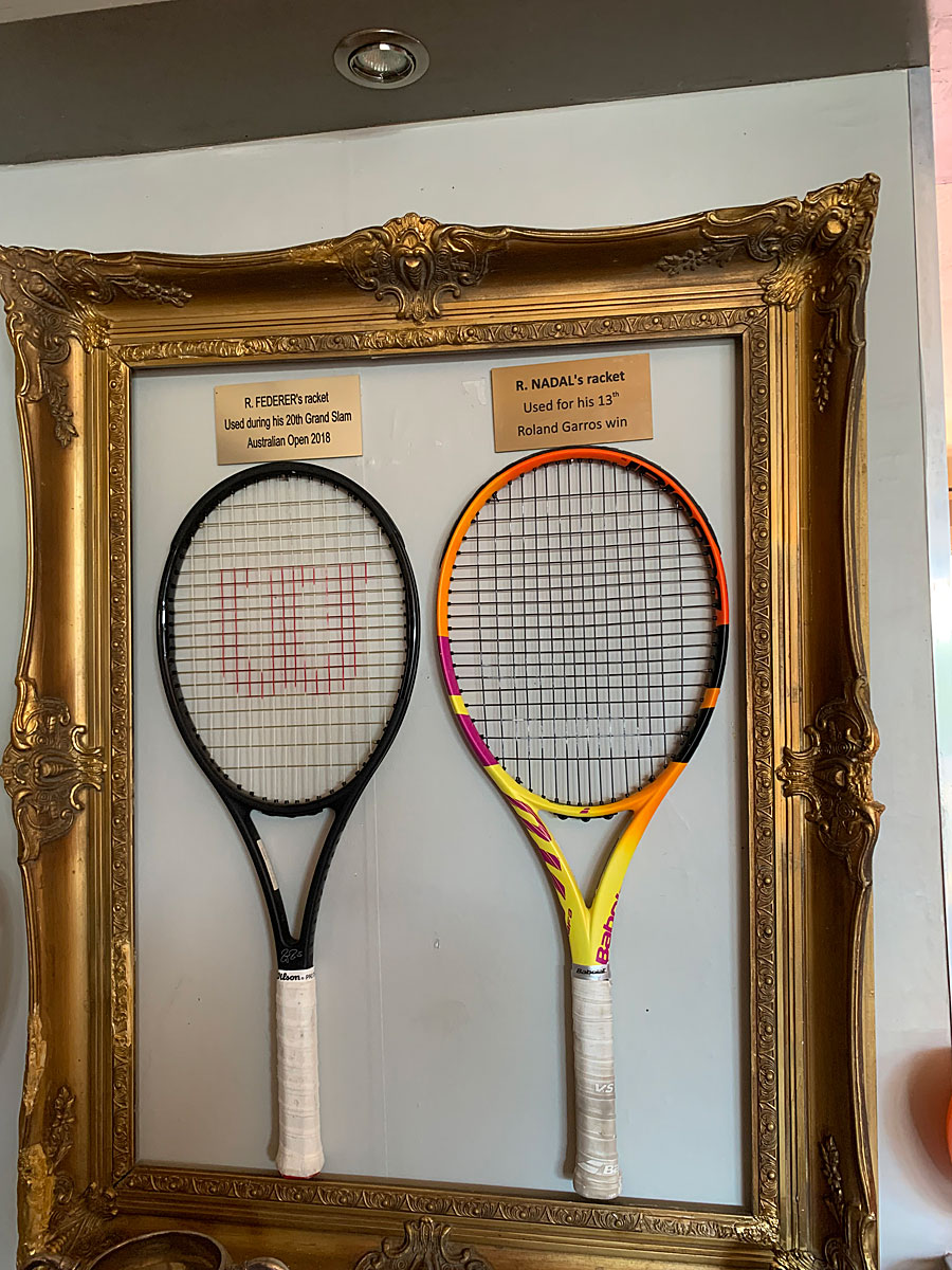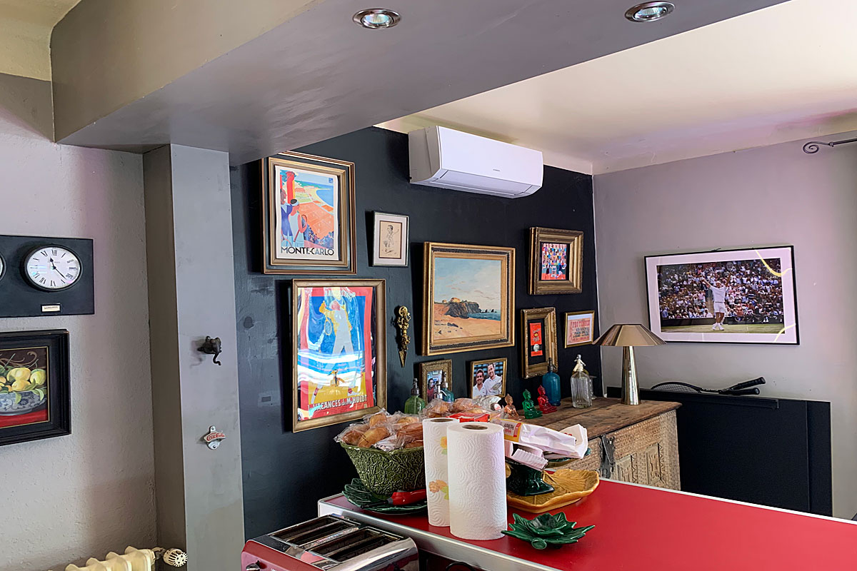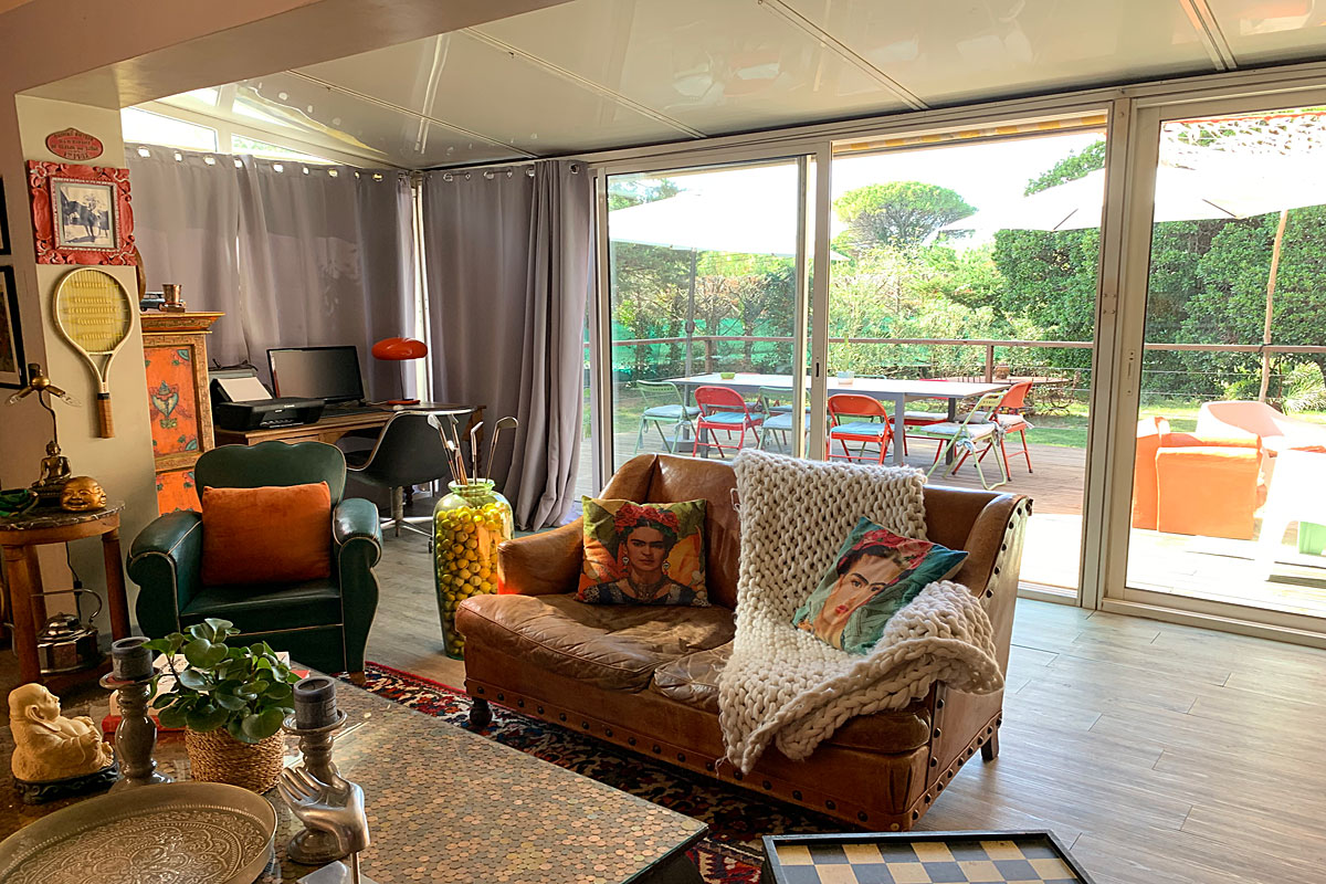 Entry hall, off which is a large open plan living-room with air-conditioning, sofas and several armchairs with a nice fireplace. Lots of the furniture and artwork is vintage giving a bohemian feeling, tennis raquets are displayed on the walls, including some from famous players.