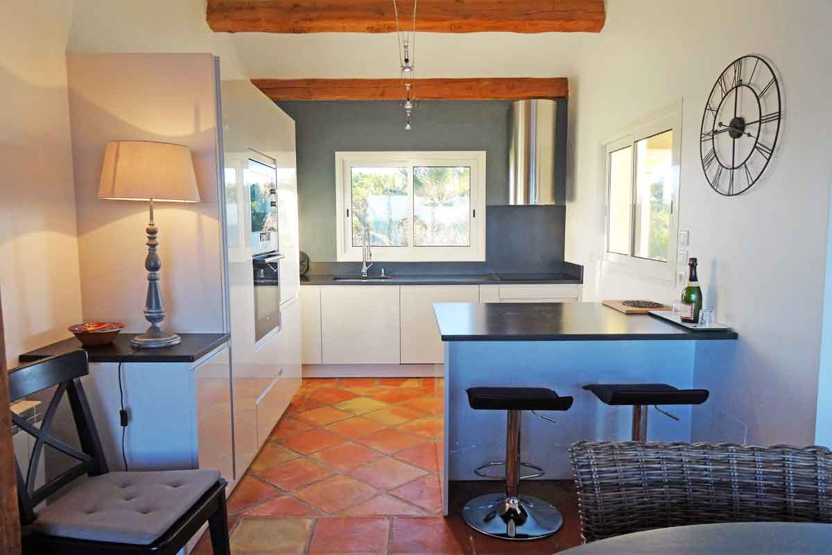 Steps lead from the garden up to the main entrance, you step into the large open plan lounge/dining area with comfortable sofas, easy chairs and dining table. This whole area is surrounded by floor to ceiling glass windows leading out onto the full length terrace with magnificent views across the South of France coastline and swimming pool.