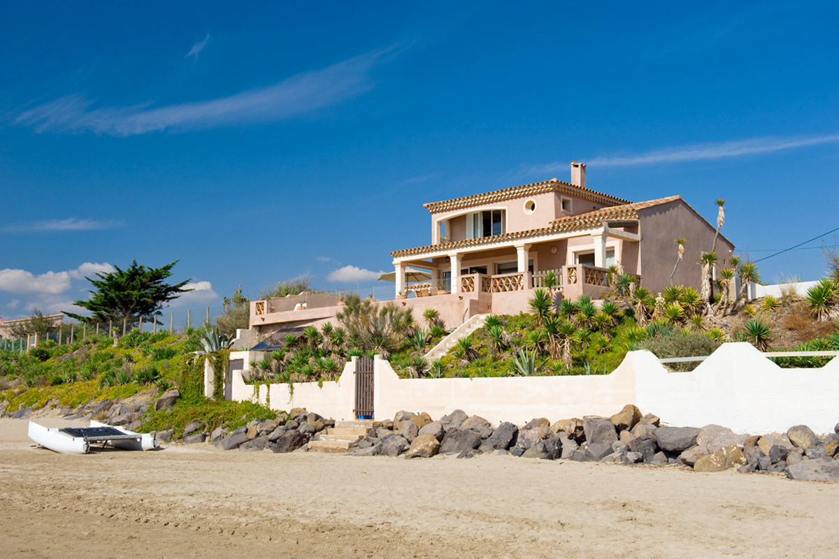 South of France, a beachfront modern villa with heated pool, large garden, 3 bedrooms, 3 bathrooms, partial air conditioning and Wi-Fi in a dream-come-true position in Grau d'Agde, Languedoc-Occitanie with steps leading down to the beach.