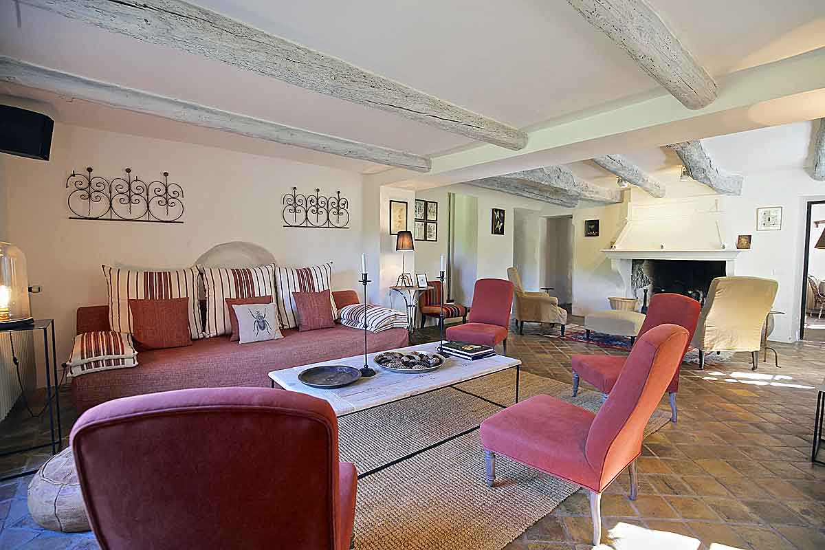 A large salon with lots of original features including beams, cosy sofas.