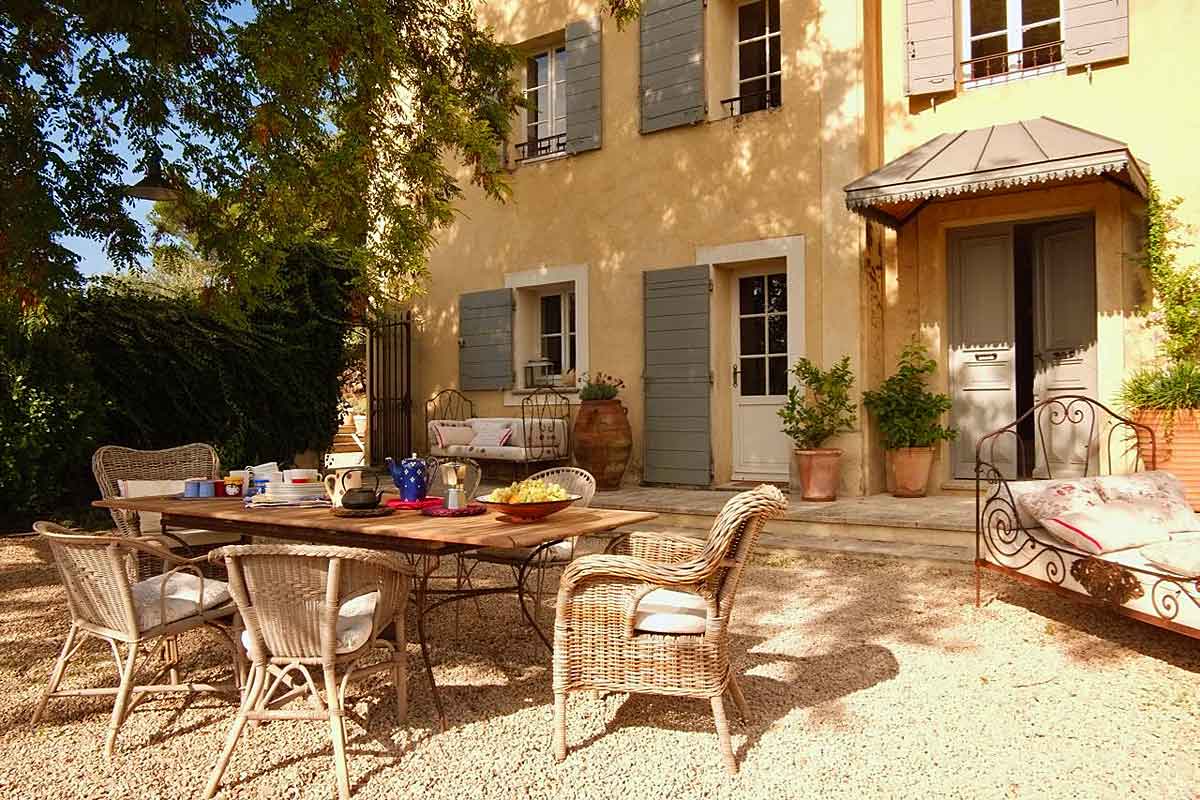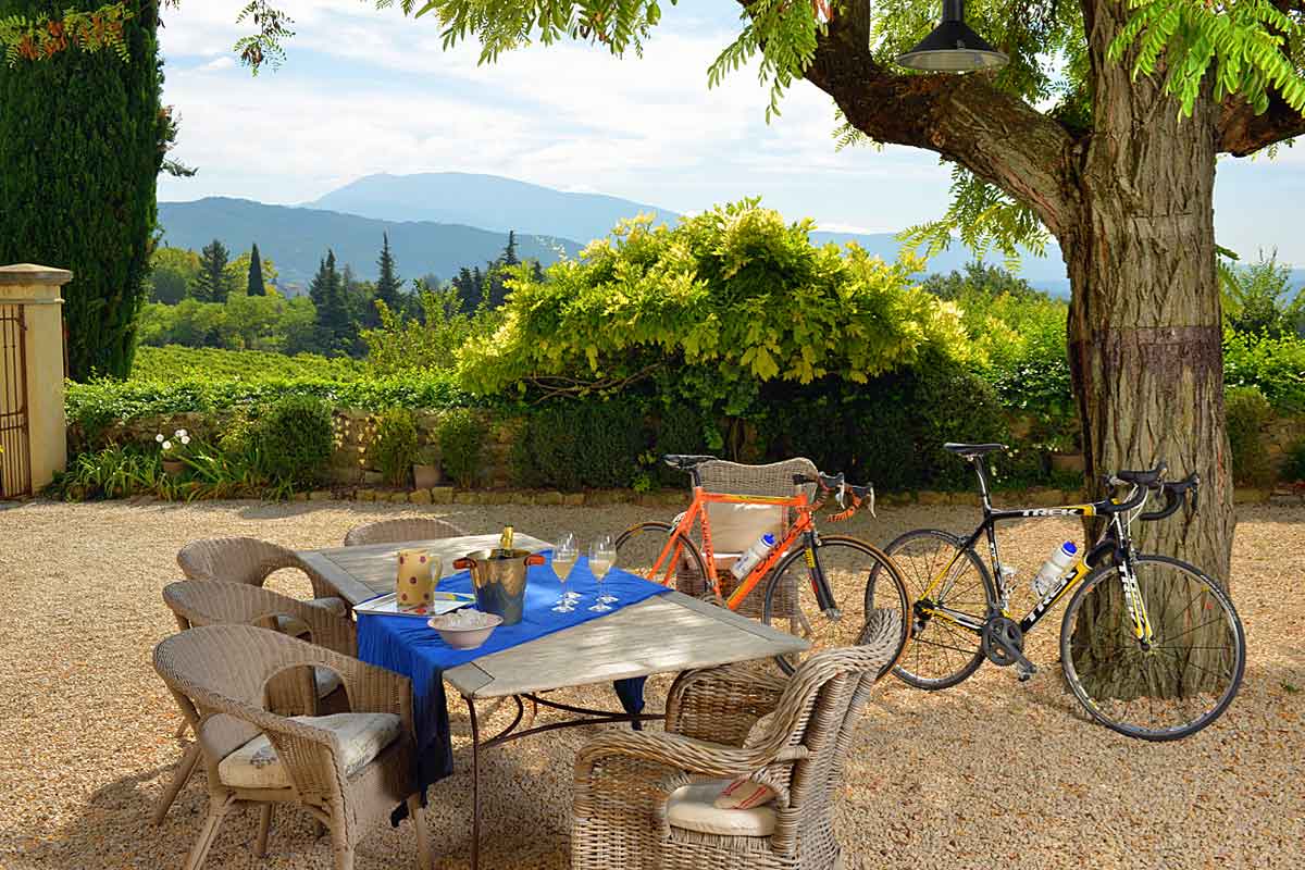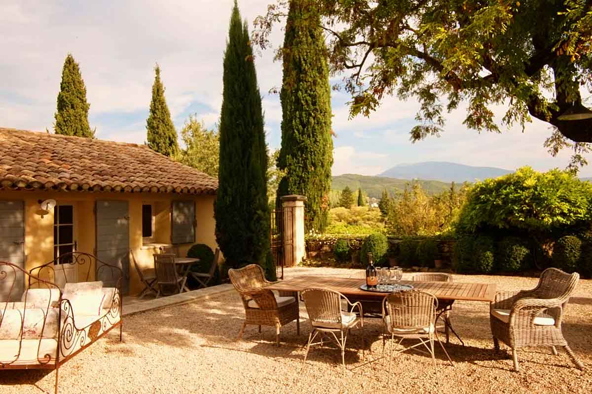 A dining area in the front patio, with table for 10 under the Acacia tree with 2 day beds and views to Mont Ventoux and the Dentelles de Montmirail.