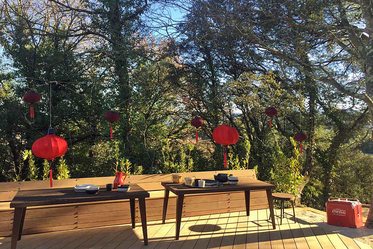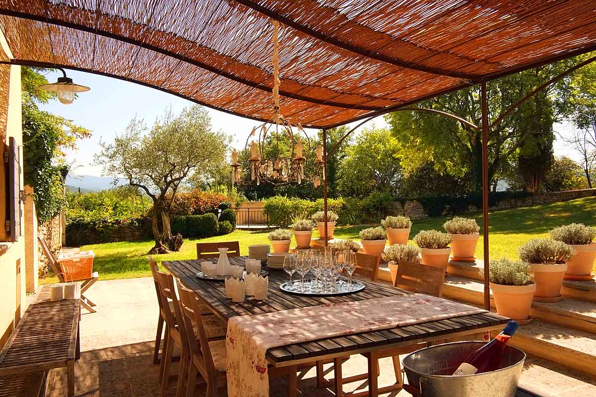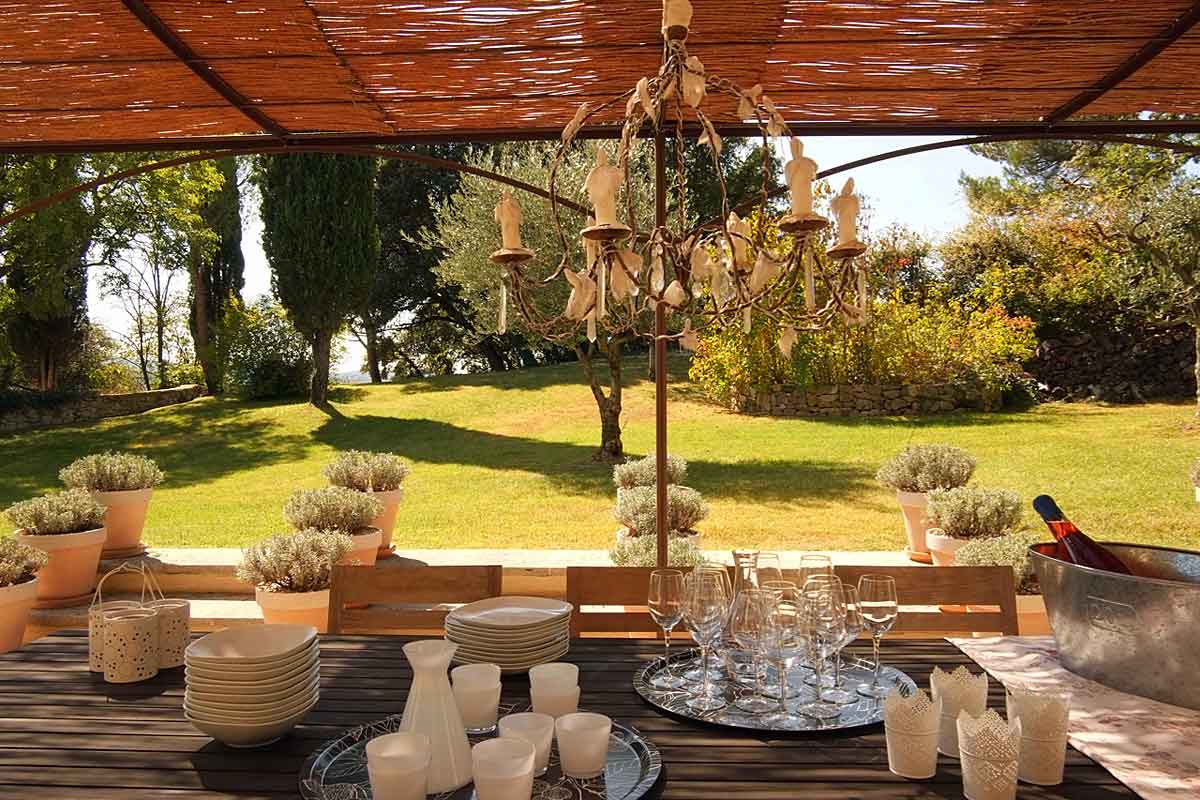The terrace near the kitchen with a pergola shaded dining table for 12, built-in charcoal BBQ and garden views. At night the table is romantically lit by a chandelier.