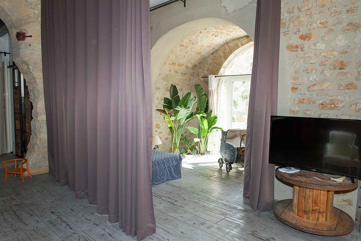 The property is like an American style ground floor loft, a large open plan area, bleached wooden floor, beautifully renovated stone walls, and air-conditioning.