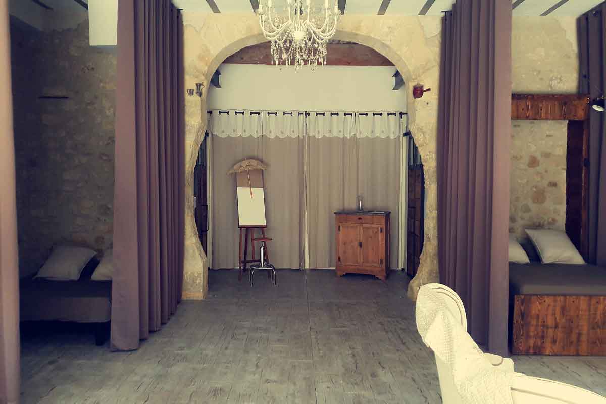 The sleeping area has huge, heavy curtains to section the area off and offer privacy. A double bed, hand crafted by a local trademen neatly folds against the wall when not in use. You could choose to leave the bedroom area curtained off all the time, and there would still be lots of space in the gite.