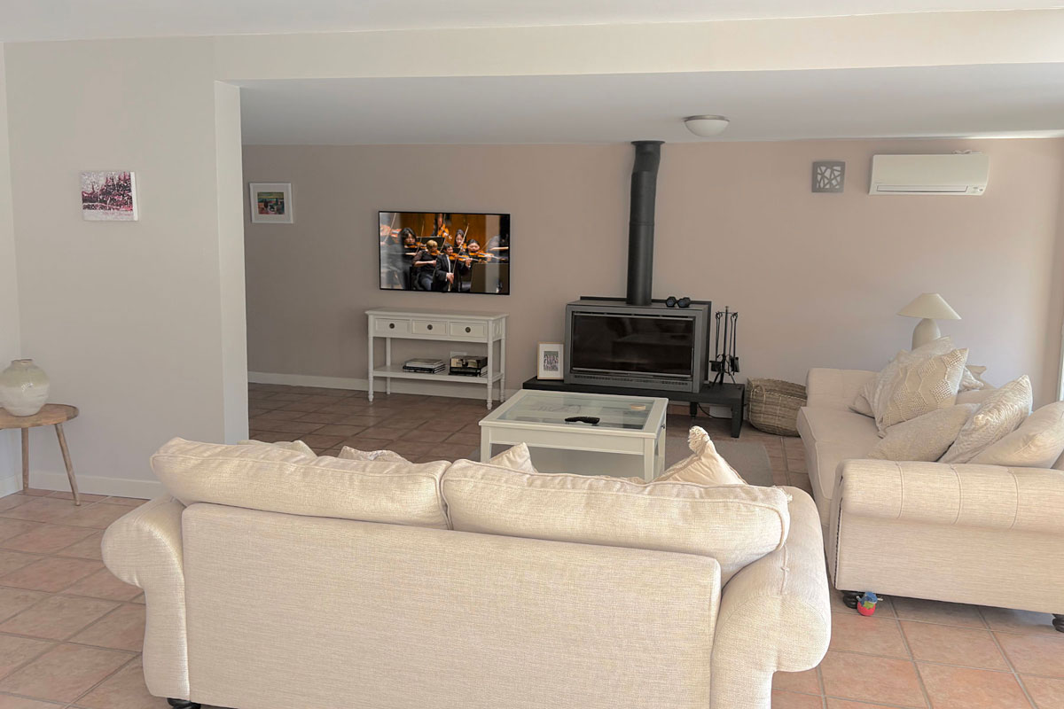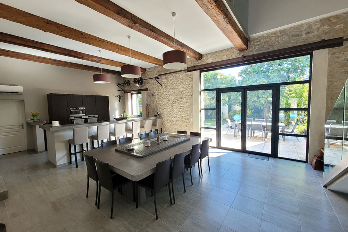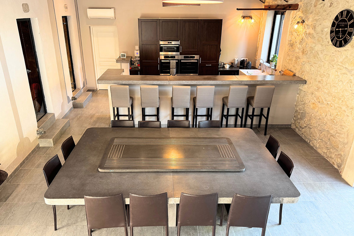 The dining table comfortably seats 10 people, the kitchen separated by a breakfast bar is fully equipped with everything that you could need for a family holiday in the South of France.