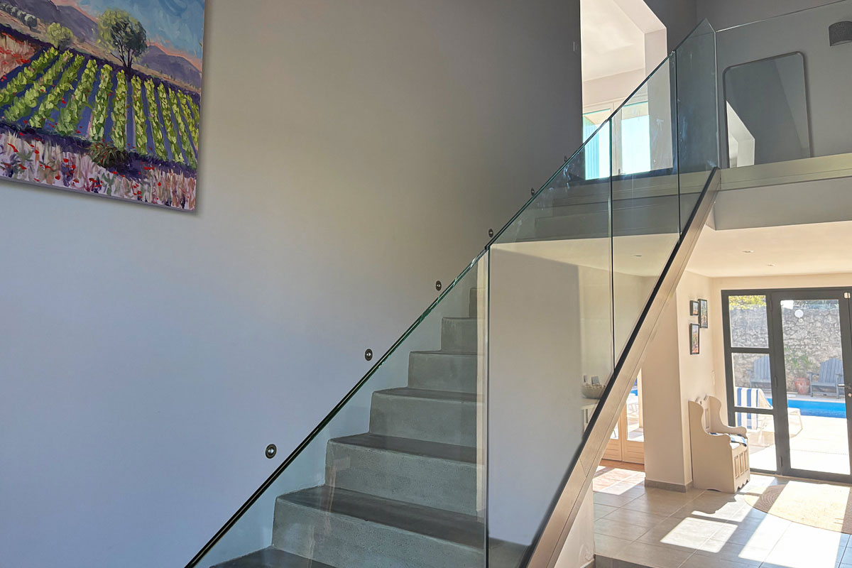 Staircase leads to the first floor, to the right on the mezzanine is the air-conditioned TV room (86 inch smart TV, with UK channels) which has a glass wall overlooking the ground floor.