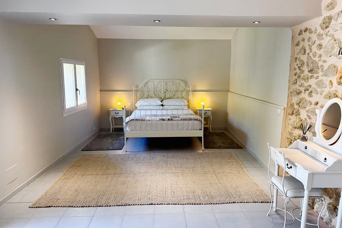 Ground floor bedroom, King size double bed, air-conditioned, French doors lead out to the terrace and garden, en-suite shower room with wc and wash basin. (Possibility of adding an additional bed if twins required, ask for more details). Ideal for grandparents who would like a little more privacy.