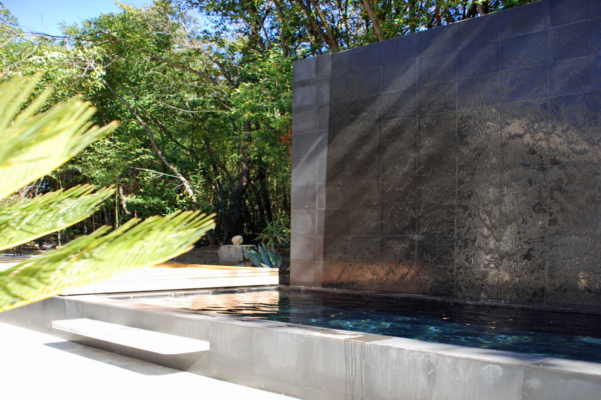 The private heated plunge pool has a 'wall of water' feature continuously cascading down the striking local black basalt - stunning against the greenery of bamboo and palms.
