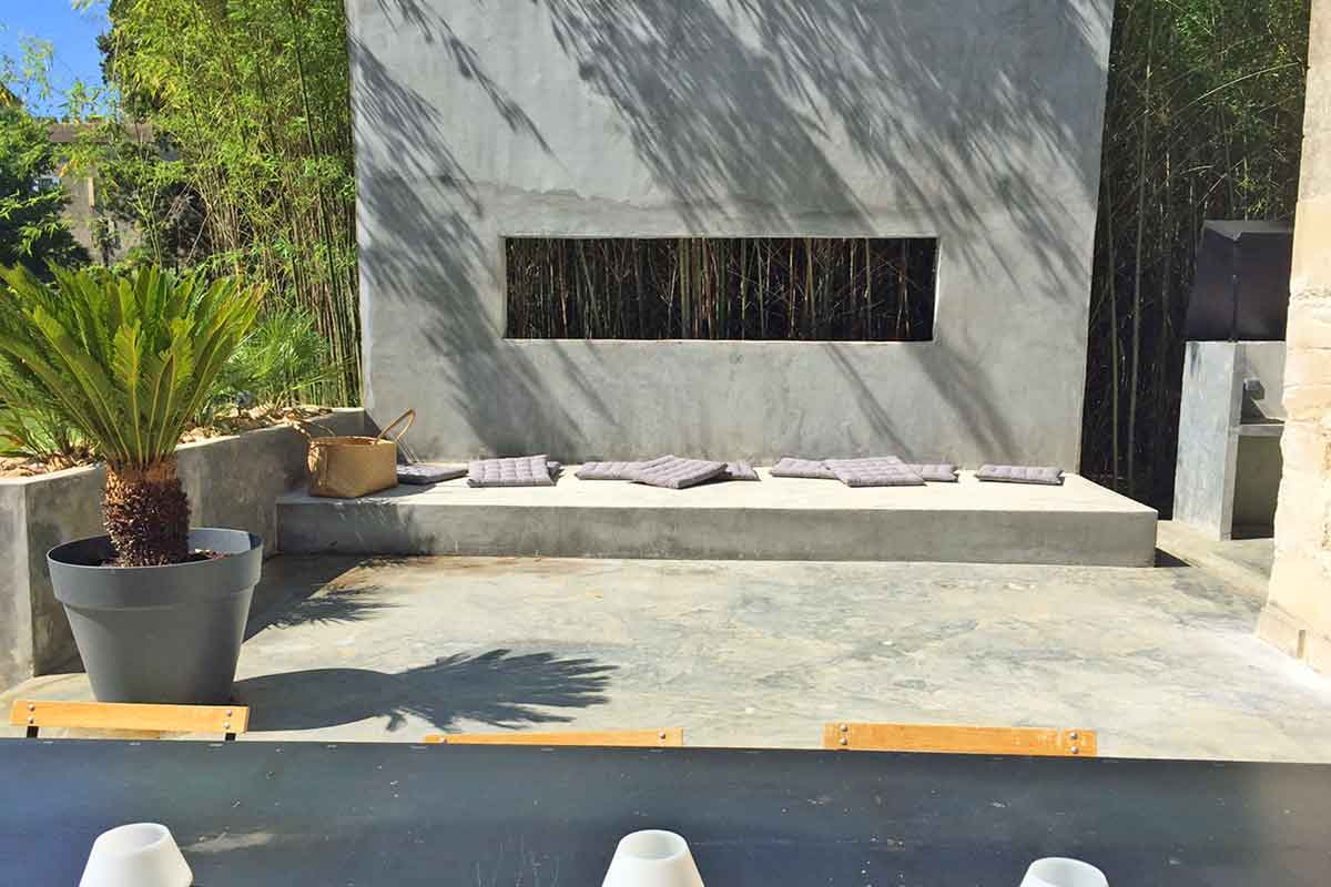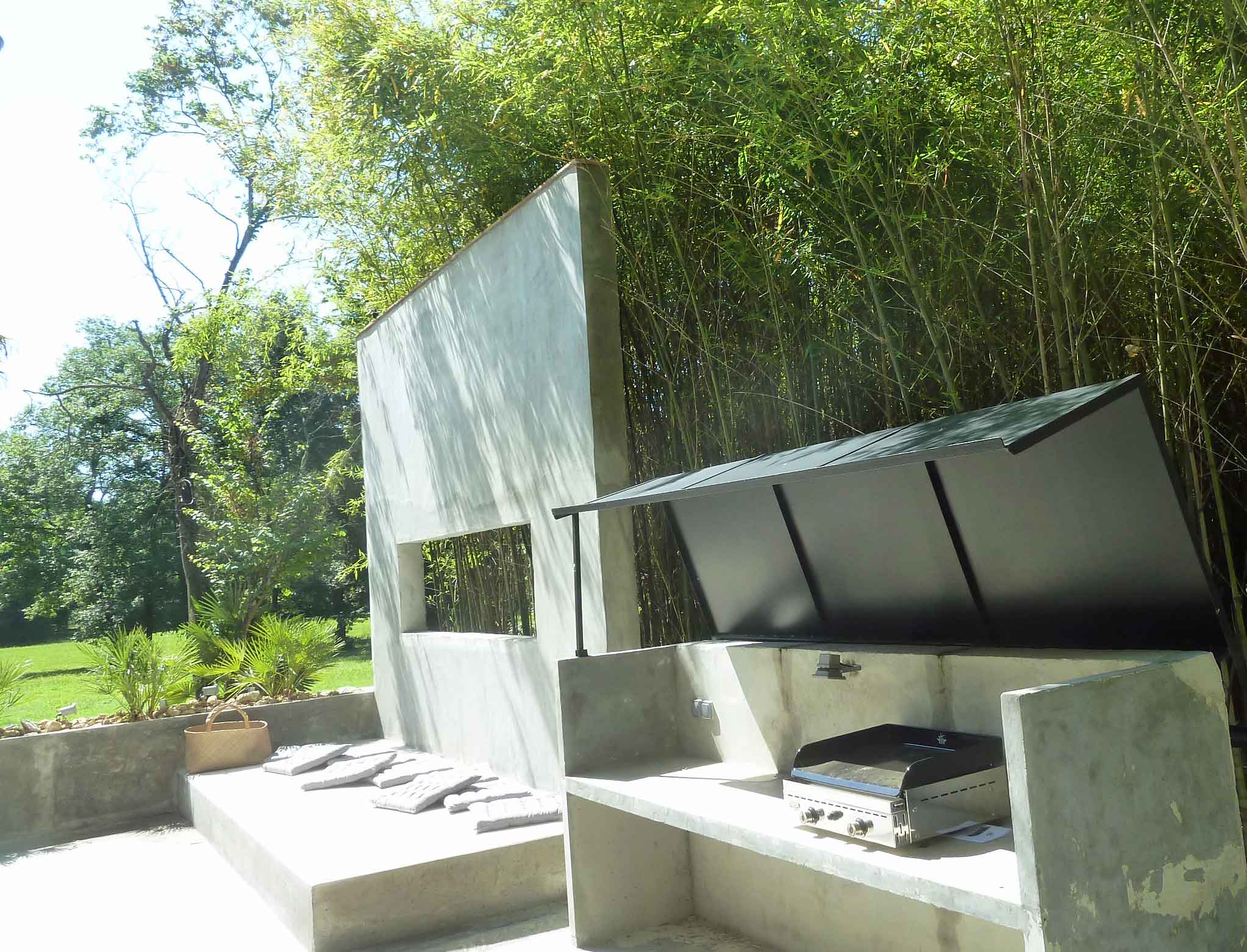 The immense terrace (apprx 150m2) overlooks the park with views to the Chateau and has a seating area with comfortable cushions, an area for outdoor dining and an outdoor kitchen with stone sink and plancha.