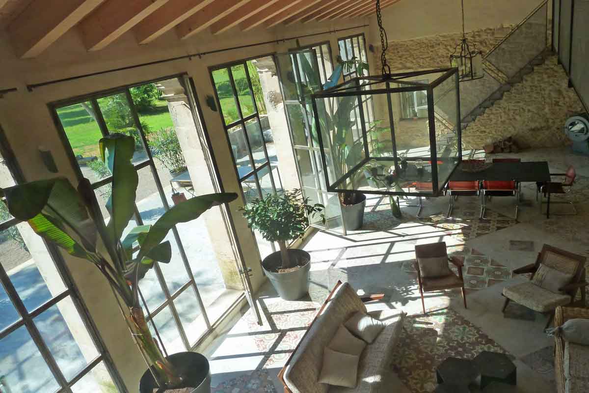 The living room is an amazing space - natural stone walls, beautiful original Languedoc floor tiles, huge hanging lighting, a cynlindrical wood burner and large plants in pots that thrive in this glass space. Floor to ceiling doors lead out on to a vast terrace, with the basalt heated plunge pool at one end and a large raised terrace at the other.