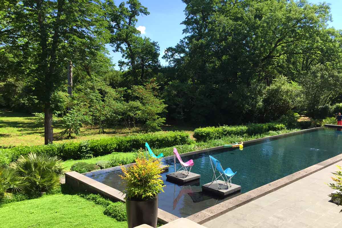 Clients renting the Orangerie have access to the main pool at HE097A Domaine Occitania and communal areas. The magnificent salt water infinity pool, 24m x 6m x 0.20cm-1.3m-1.8m, is shared by all 8 properties. At the shallow end a 'plage Californie' (depth 20cm) with 3 stone islands and Roman steps between each one lead down to the deeper section. The finish of black and basalt glass mosaic, complements the surrounding greenery and attracts the summer heat raising the pool temperature a couple of degrees higher than traditional blue tiles.