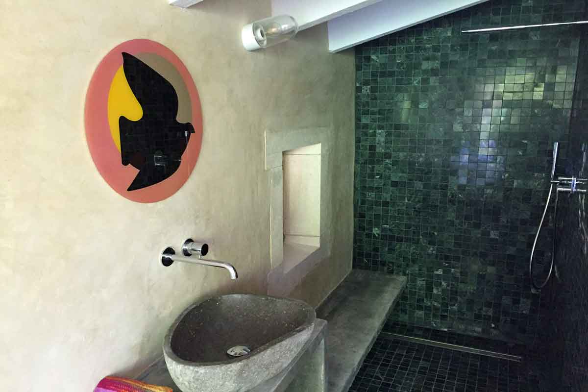 Twin room - 2 x 90cm beds (can be made into a Kingsize 180cm) with walk in shower and basin. Air Conditioned. Separate wc. A wall of glass with a French doors gives out to the exterior Balinese shower and stone bath and views to the Bamboo forest. Wheelchair accessible.