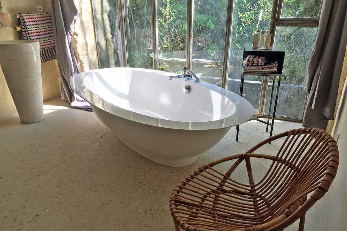 Sleeping 6 people in 3 air conditioned bedrooms (one of which is accessible for disabled guests) with 4 bathrooms. Floor to ceiling stone columns and flooded with light from five 4 metre high glass windows, the property, set in almost exotic vegetation of ancient bamboo, mature palms, and green oak, has the feel of living outside from the inside.
