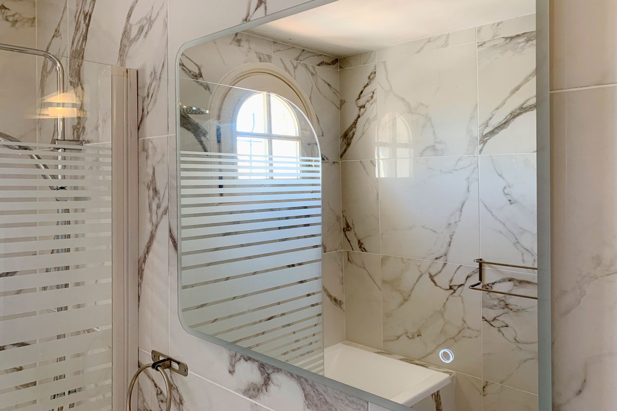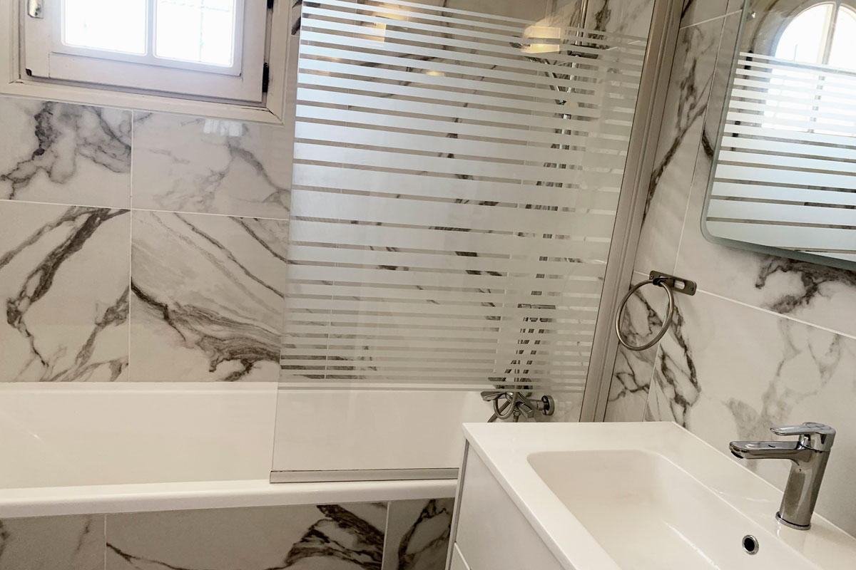 Recently renovated in a grey and white style, there is a bath with overhead rain shower, sink and wc.