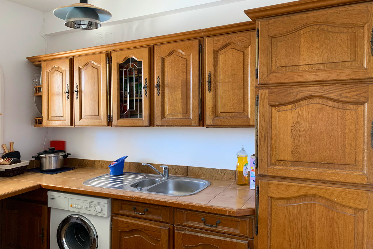 To the left is the fully equipped modern white kitchen, there is also another kitchen within the kitchen too which houses the washing machine.
