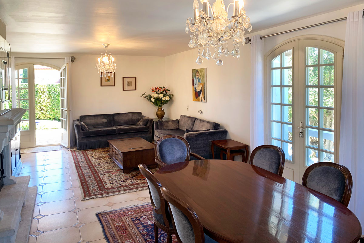 The main entrance is from the secure front courtyard, to the right is the air-conditioned lounge and dining room, with some lovely contemporary art work on display. French doors lead out to the pool and terraces.