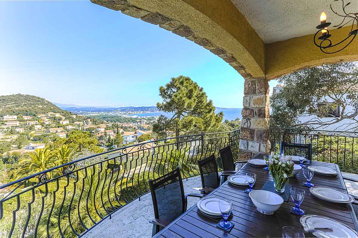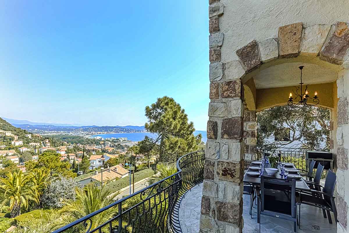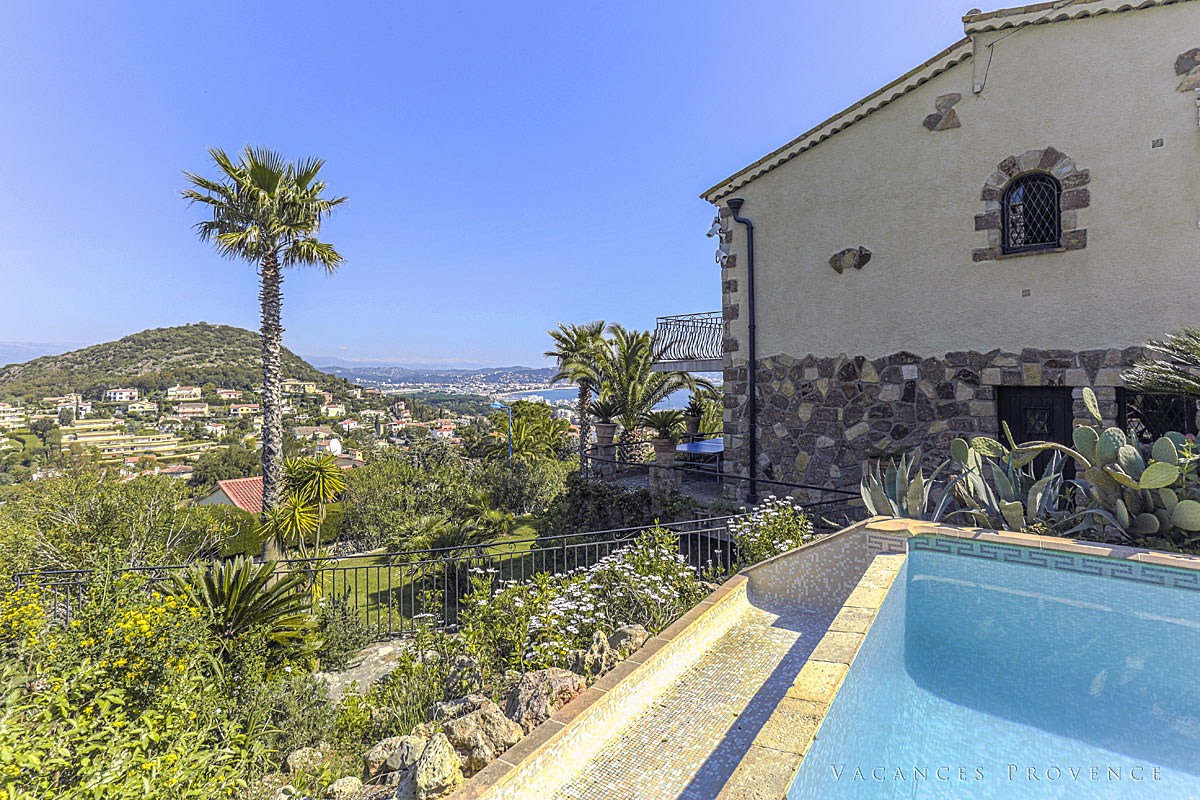 South of France holiday villa to rent in La Napoule, near Cannes, Cote d'Azur, Air-Con, 5 ensuite bedrooms, 13m long infinity pool, stunning views of Cannes bay and beyond, walking distance to beach, shops and restaurants.  2026 Prices same as 2025.