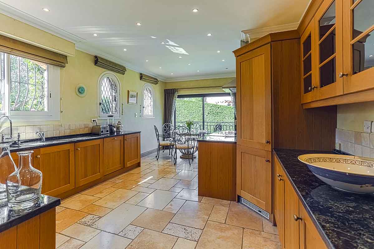 Double doors from the hall open onto the large modern fitted kitchen with solid oak units and black granite work surfaces, a huge corner larder fridge, double sinks, two full ovens, a four burner hob with extractor fan, dishwasher, larder freezer, built in microwave and air-conditioning. The kitchen dining area has a flat screen TV and a circular dining table for 6 people. Sliding windows open onto the infinity pool below.