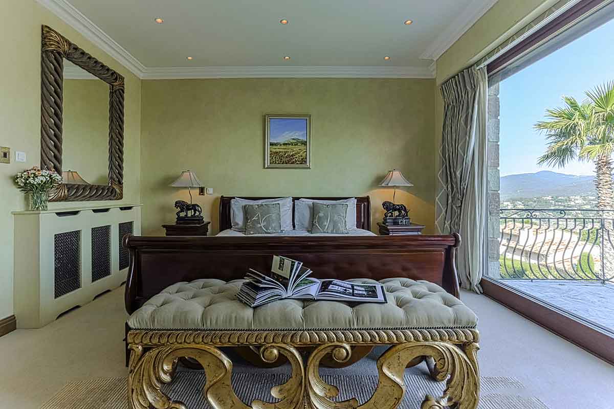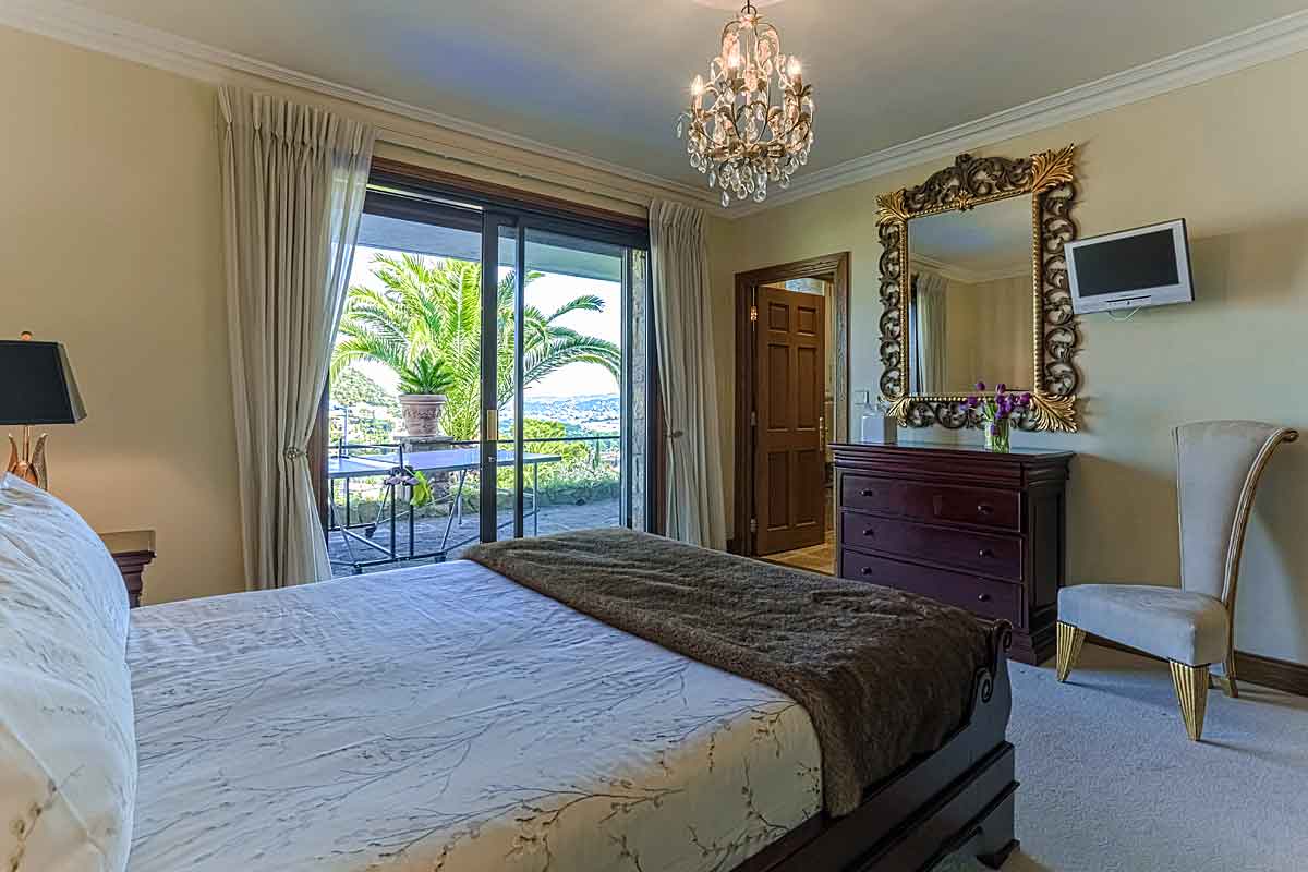 A large beautiful air-conditioned bedroom with a king size bed, fitted wardrobes, flat screen TV and . Sliding doors open onto the balcony with views to the bay of Cannes and La Napoule harbour. En suite bathroom with full size bath, shower unit, washbasin and toilet.