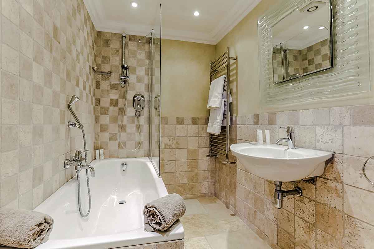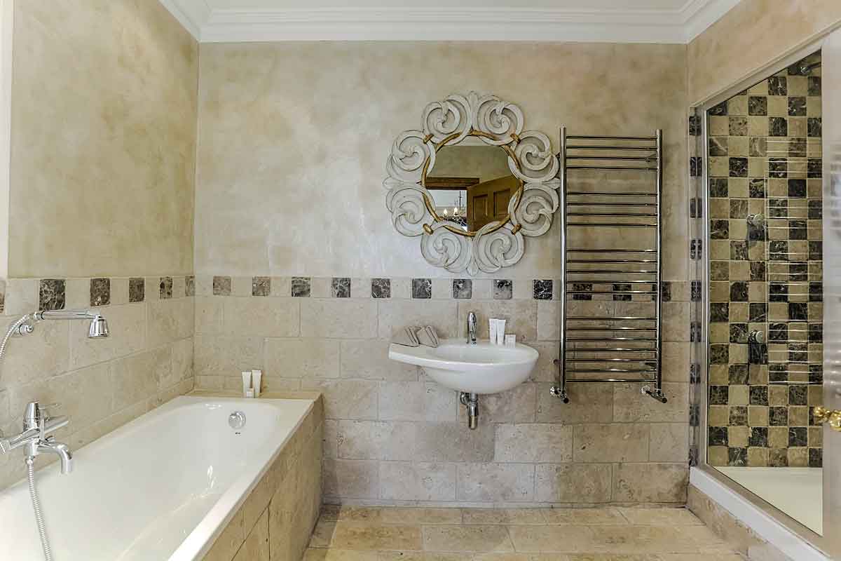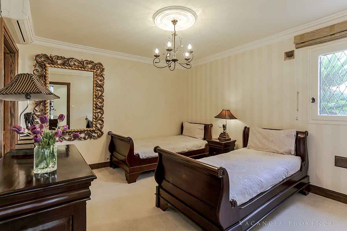 Another air-conditioned twin room with Bateau beds, bedside cabinet and TV. This room is on the opposite side to the other three bedrooms and has a window with views of the garden. En suite bathroom with full size bath with shower attachment, washbasin and toilet.