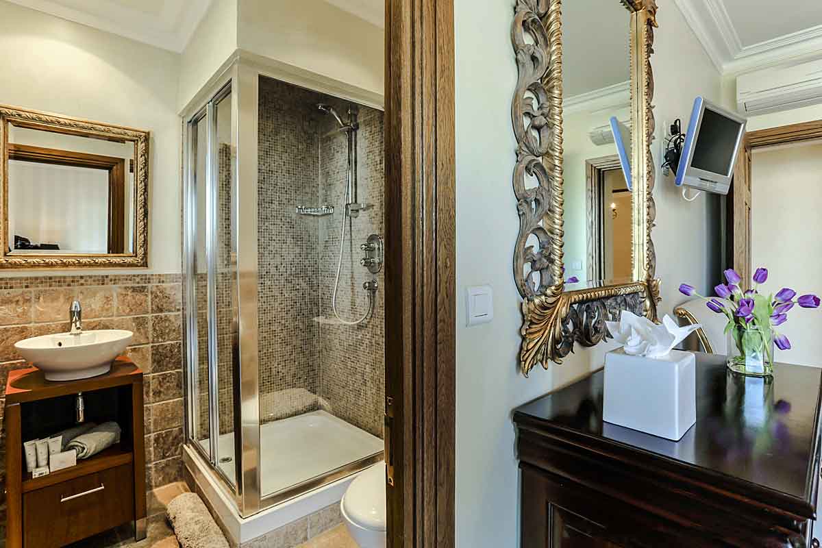 With twin Bateau beds, air-conditioning wardrobe, bedside cabinet and TV . Sliding doors open on to the balcony with the same panoramic views over the bay of Cannes. En suite shower room with shower unit, washbasin and toilet.