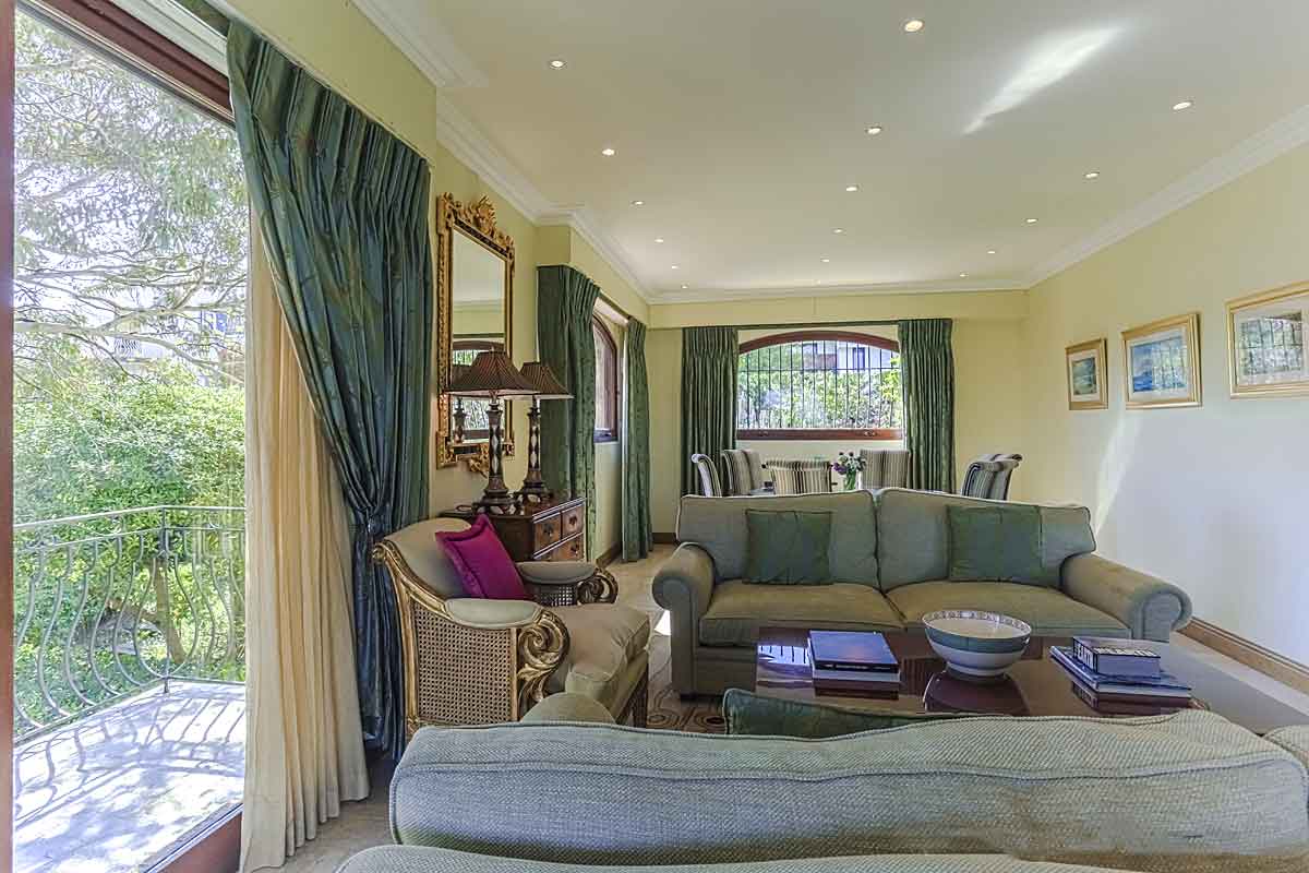 A more formal and beautifully furnished room with two sofas, an armchair and air-conditioning. The dining area has a very ornate glass dining table and seating for 6 people. In the lounge area large sliding doors open onto the balcony with the same views as the TV room. In the dining area windows open onto the garden.
