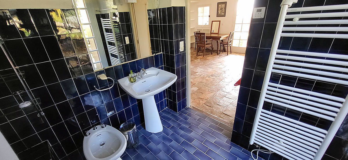 Descending the stone stairs from first floor, there is a hallway with a shower room and wc, as well as a laundry room with washing machine, ironing board and sink, an additional fridge and freezer.
