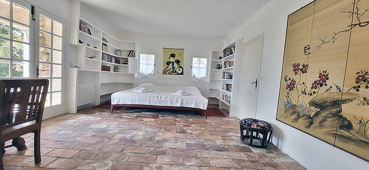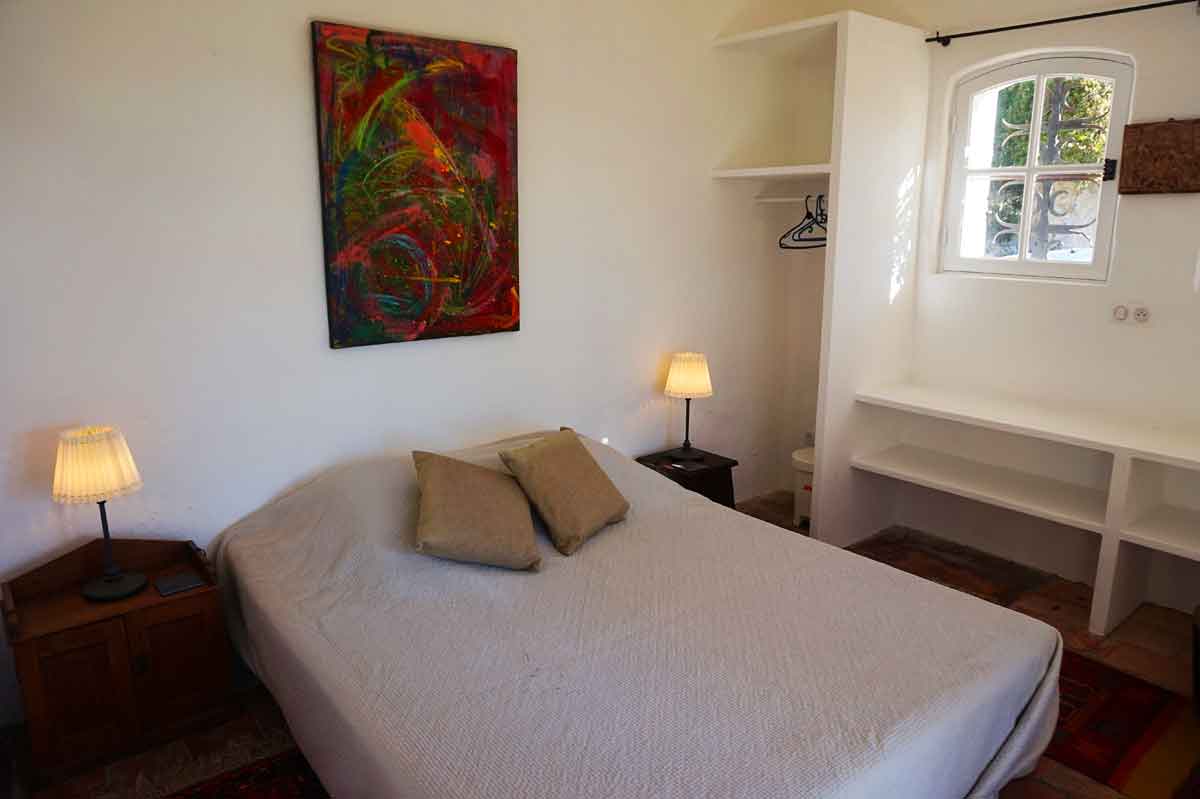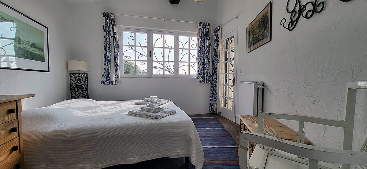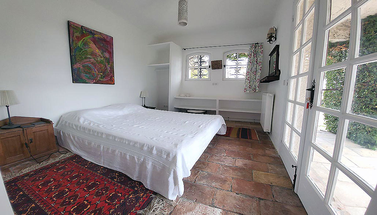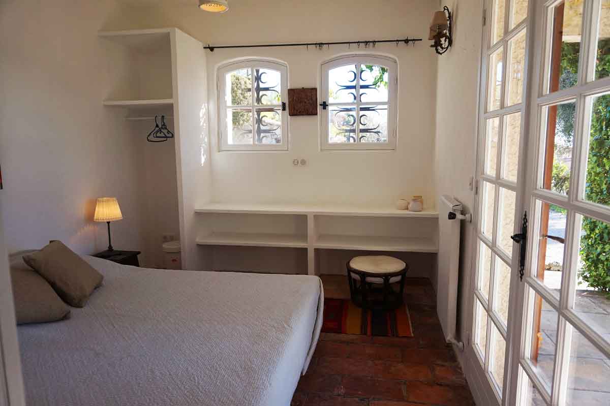 Bedroom 1 - with a double bed (160cm), and French doors leading to a terrace & view of the pool from the window.