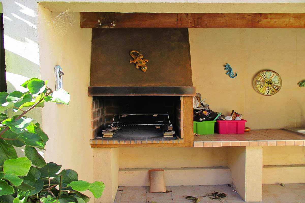 The terrace off the kitchen has a built in charchoal BBQ .