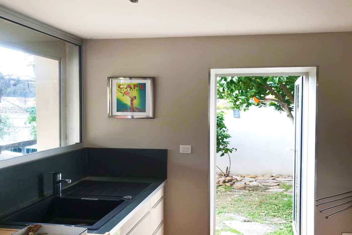 On entering to the left toward the kitchen the large entrance has sliding doors on both sides of the room which lead out to dining terraces and an indoor courtyard which has a built in BBQ and is shaded.