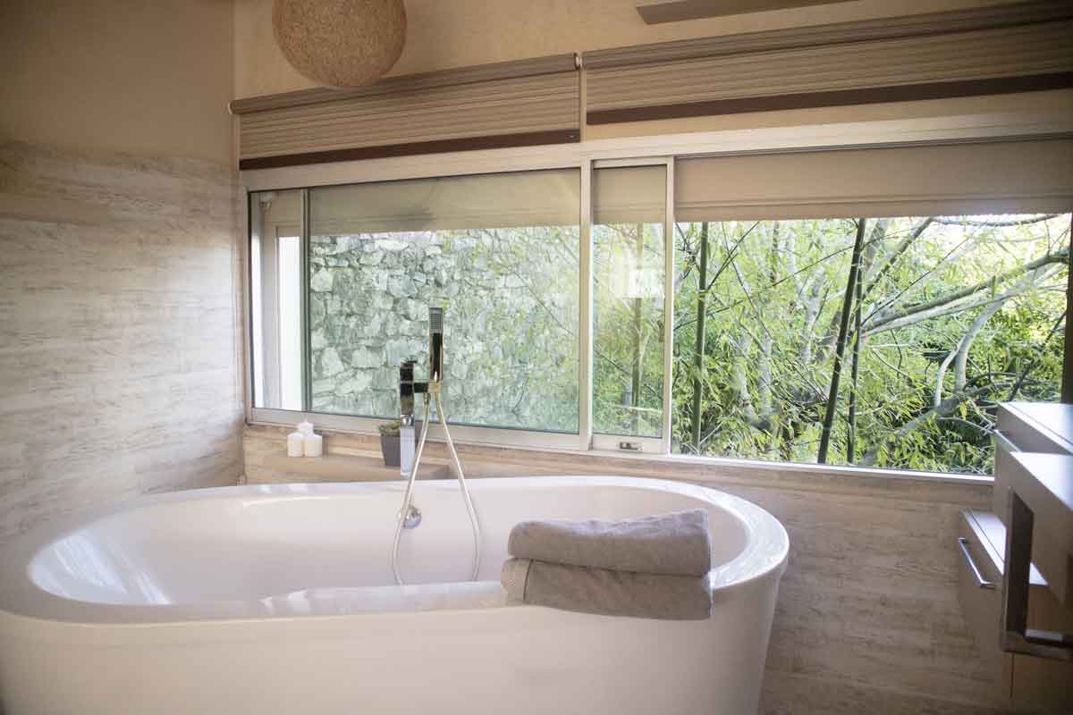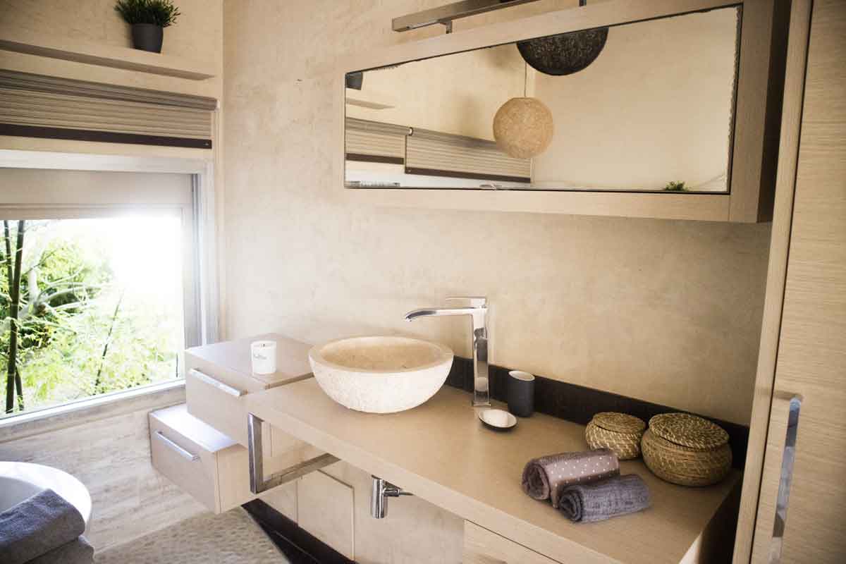 A couple of steps lead to the Master bedroom, air-conditioned, double bed, a walk-in wardrobe, window overlooking the terrace, large modern en suite bathroom, Roman shower, freestanding bath, wc and vanity unit.