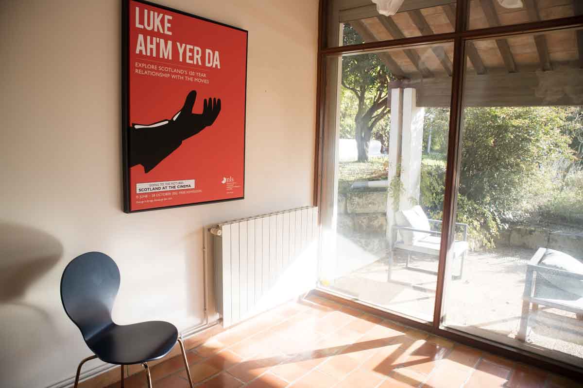 Doors open onto a terrace overlooking the pool, the terrace has a wire barrier.