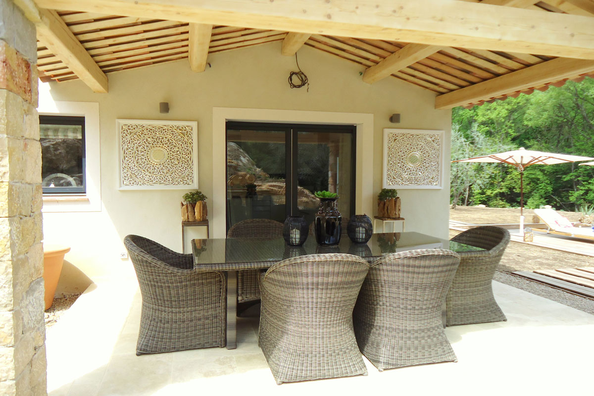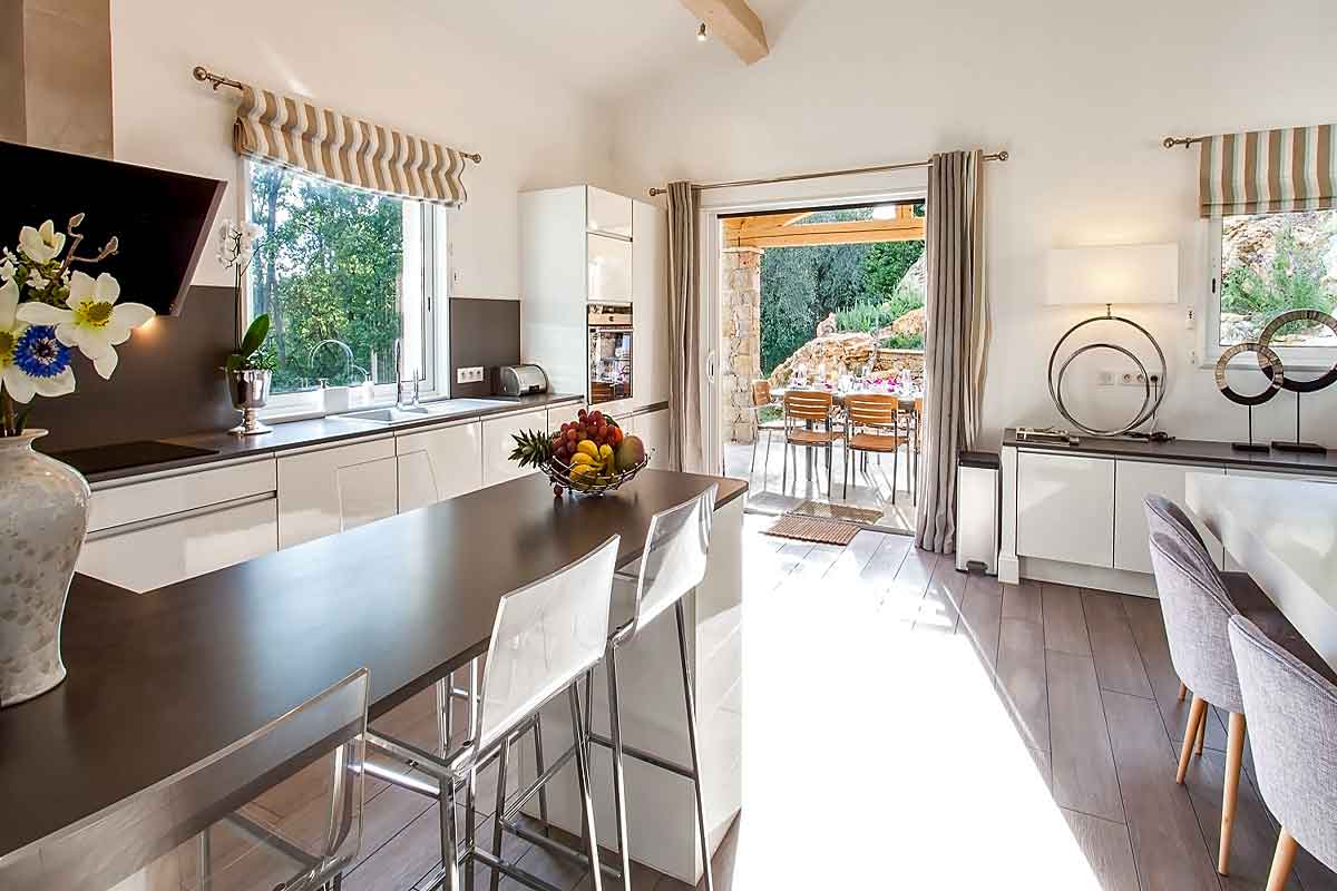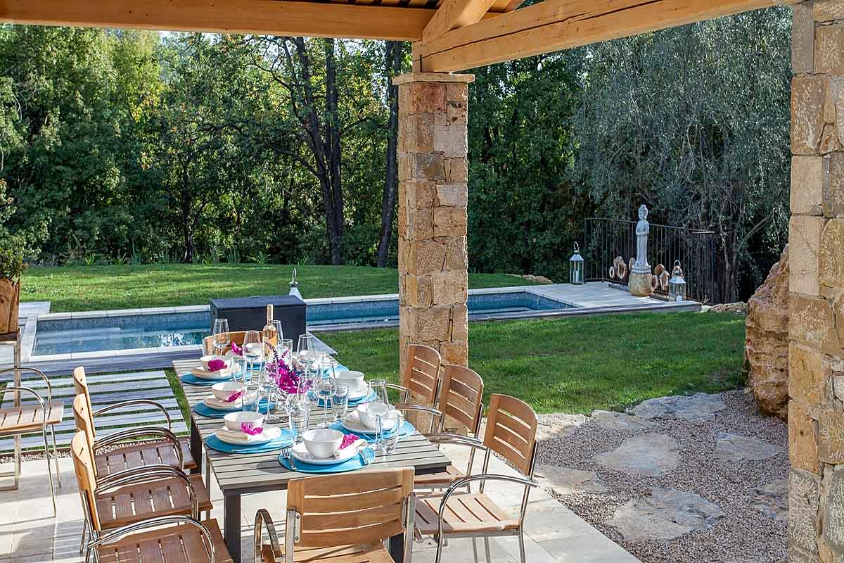 This French holiday rental has been tastefully built in Provencal style. Designed by an interior designer throughout with a lovely light spacious and luxurious feel. The living space is open plan, extremely spacious with large sliding doors onto the lawned gardens and pool area. Lovely views across woodland means this side is not overlooked.